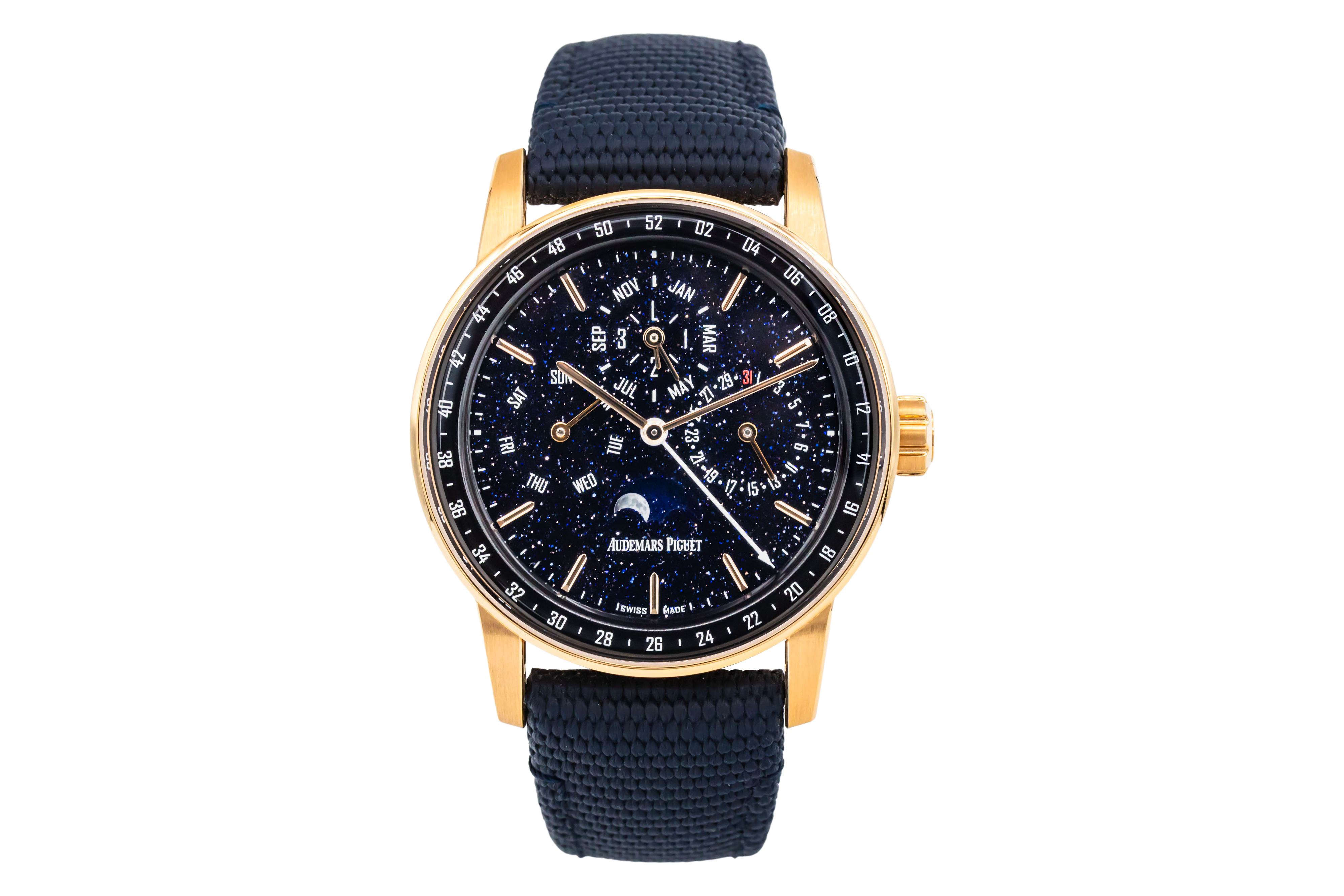 This Audemars Piguet CODE 11.59 26394OR.OO.D321CR.01 has a blue aventurine dial and a leather strap. This Audemars Piguet has undergone a thorough inspection of accuracy, functionality and condition at our Audemars Piguet certified service centre to determine the level of reconditioning required to meet our strict standards. It has also been checked against our records to ensure authenticity. All our watches have a 24-month warranty for your peace of mind.