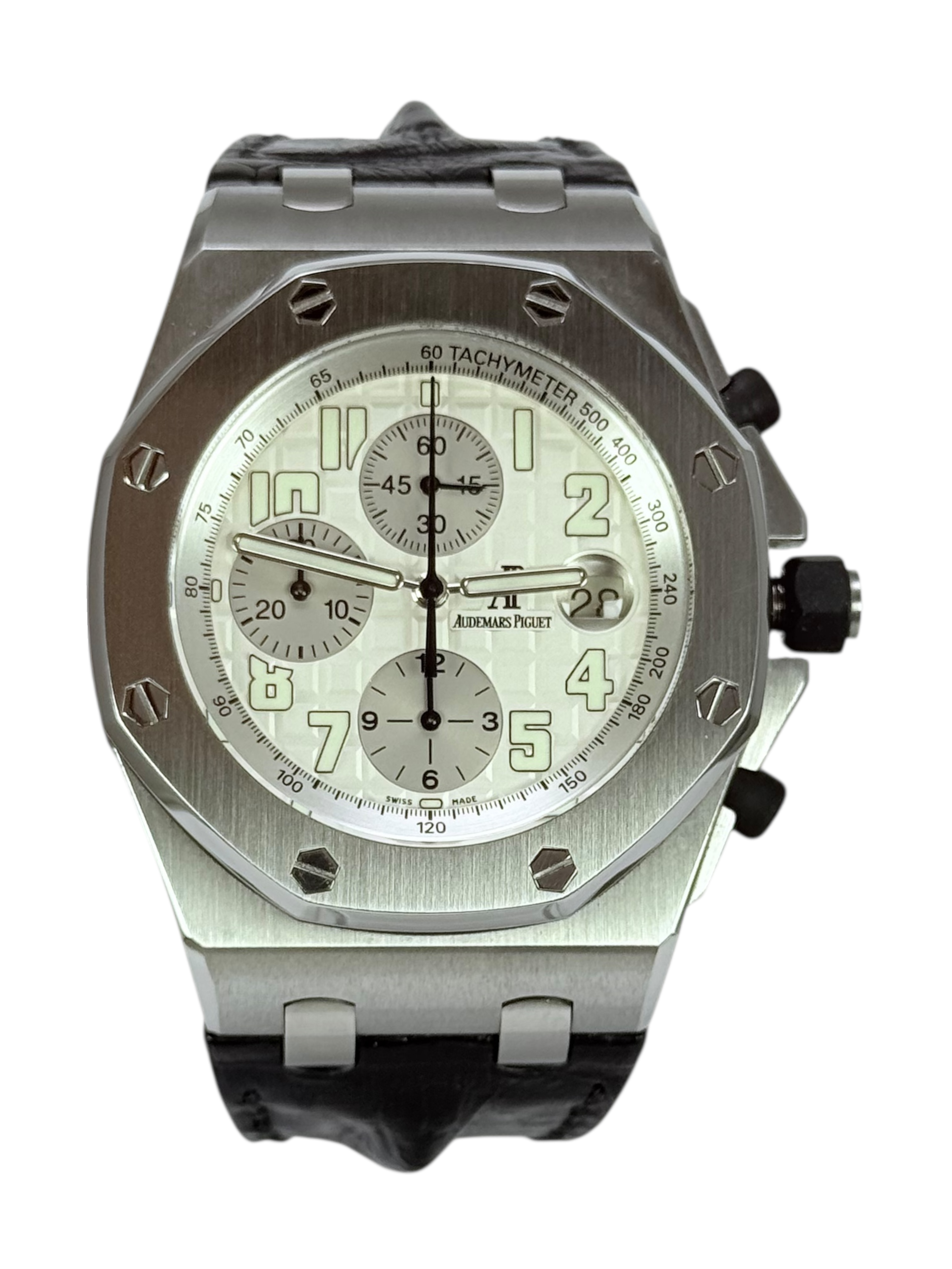 This Audemars Piguet Royal Oak Offshore 26020ST.OO.D001IN.02.A has a silver arabic dial and a leather strap. This Audemars Piguet has undergone a thorough inspection of accuracy, functionality and condition at our Audemars Piguet certified service centre to determine the level of reconditioning required to meet our strict standards. It has also been checked against our records to ensure authenticity. All our watches have a 24-month warranty for your peace of mind.