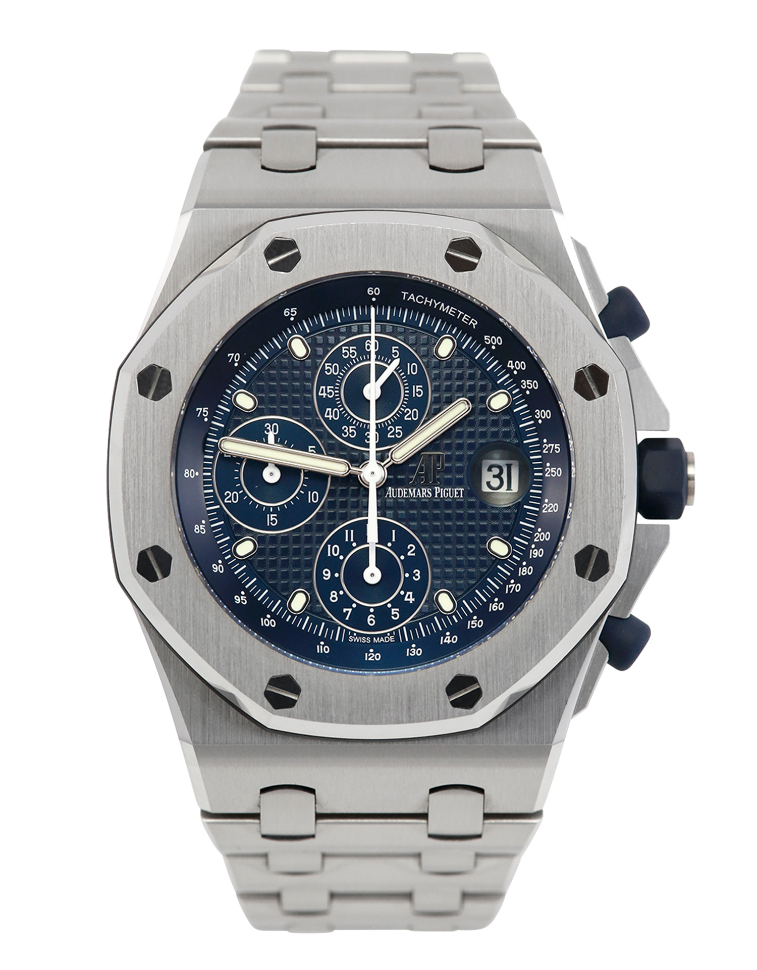 This Audemars Piguet Royal Oak Offshore 26237ST.OO.1000ST.01 has a blue dial and a bracelet strap. This Audemars Piguet has undergone a thorough inspection of accuracy, functionality and condition at our Audemars Piguet certified service centre to determine the level of reconditioning required to meet our strict standards. It has also been checked against our records to ensure authenticity. Our watches have a 24-month warranty for your peace of mind, in conjunction with any remaining manufacturer’s warranty from new or from service.