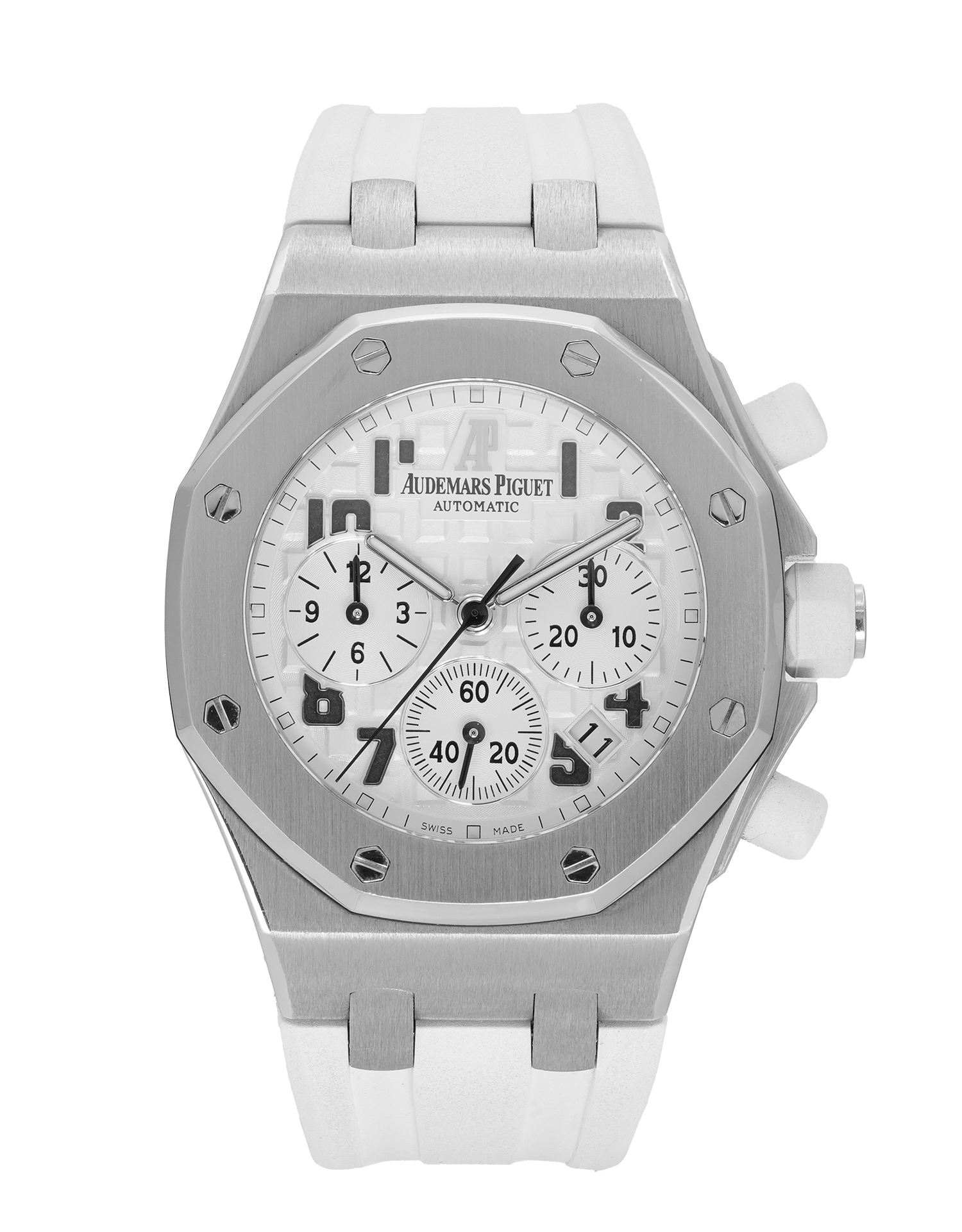 This Audemars Piguet Royal Oak Offshore 26283ST.OO.D010CA.01 has a silver dial and a rubber strap. This Audemars Piguet has undergone a thorough inspection of accuracy, functionality and condition at our Audemars Piguet certified service centre to determine the level of reconditioning required to meet our strict standards. It has also been checked against our records to ensure authenticity. All our watches have a 24-month warranty for your peace of mind.