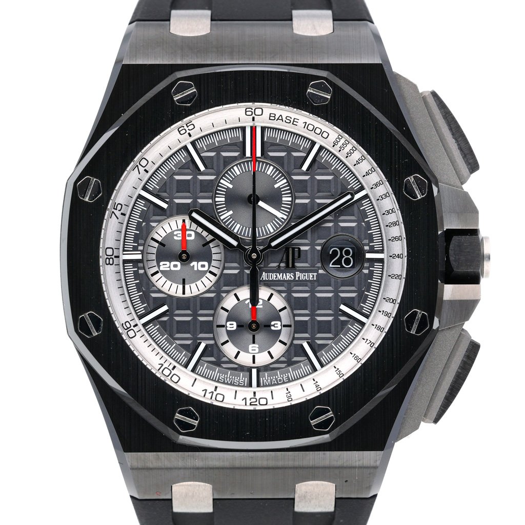 This Audemars Piguet Royal Oak Offshore 26405CE.OO.A002CA.01 has a anthracite dial and a rubber strap. This Audemars Piguet has undergone a thorough inspection of accuracy, functionality and condition at our Audemars Piguet certified service centre to determine the level of reconditioning required to meet our strict standards. It has also been checked against our records to ensure authenticity. All our watches have a 24-month warranty for your peace of mind.