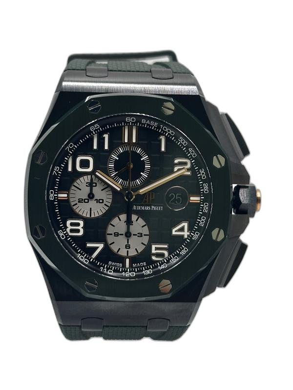 This Audemars Piguet Royal Oak Offshore 26405CE.OO.A056CA.01 has a green arabic dial and a rubber strap. This Audemars Piguet has undergone a thorough inspection of accuracy, functionality and condition at our Audemars Piguet certified service centre to determine the level of reconditioning required to meet our strict standards. It has also been checked against our records to ensure authenticity. All our watches have a 24-month warranty for your peace of mind.