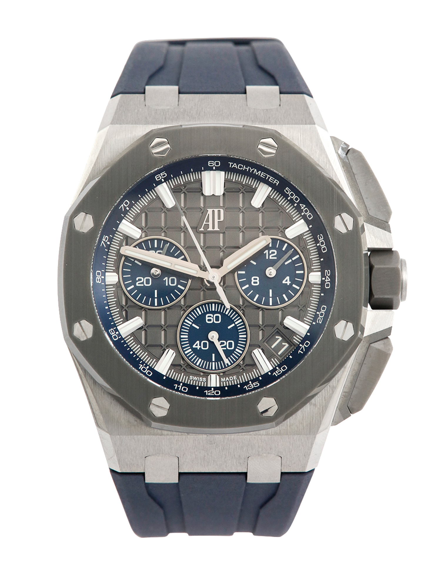 This Audemars Piguet Royal Oak Offshore 26420IO.OO.A009CA.01 has a grey baton dial and a rubber strap. This Audemars Piguet has undergone a thorough inspection of accuracy, functionality and condition at our Audemars Piguet certified service centre to determine the level of reconditioning required to meet our strict standards. It has also been checked against our records to ensure authenticity. All our watches have a 24-month warranty for your peace of mind.