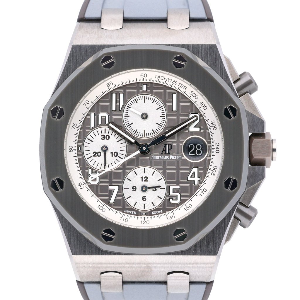 This Audemars Piguet Royal Oak Offshore 26470IO.OO.A006CA.01 has a grey arabic dial and a rubber strap. This Audemars Piguet has undergone a thorough inspection of accuracy, functionality and condition at our Audemars Piguet certified service centre to determine the level of reconditioning required to meet our strict standards. It has also been checked against our records to ensure authenticity. All our watches have a 24-month warranty for your peace of mind.
