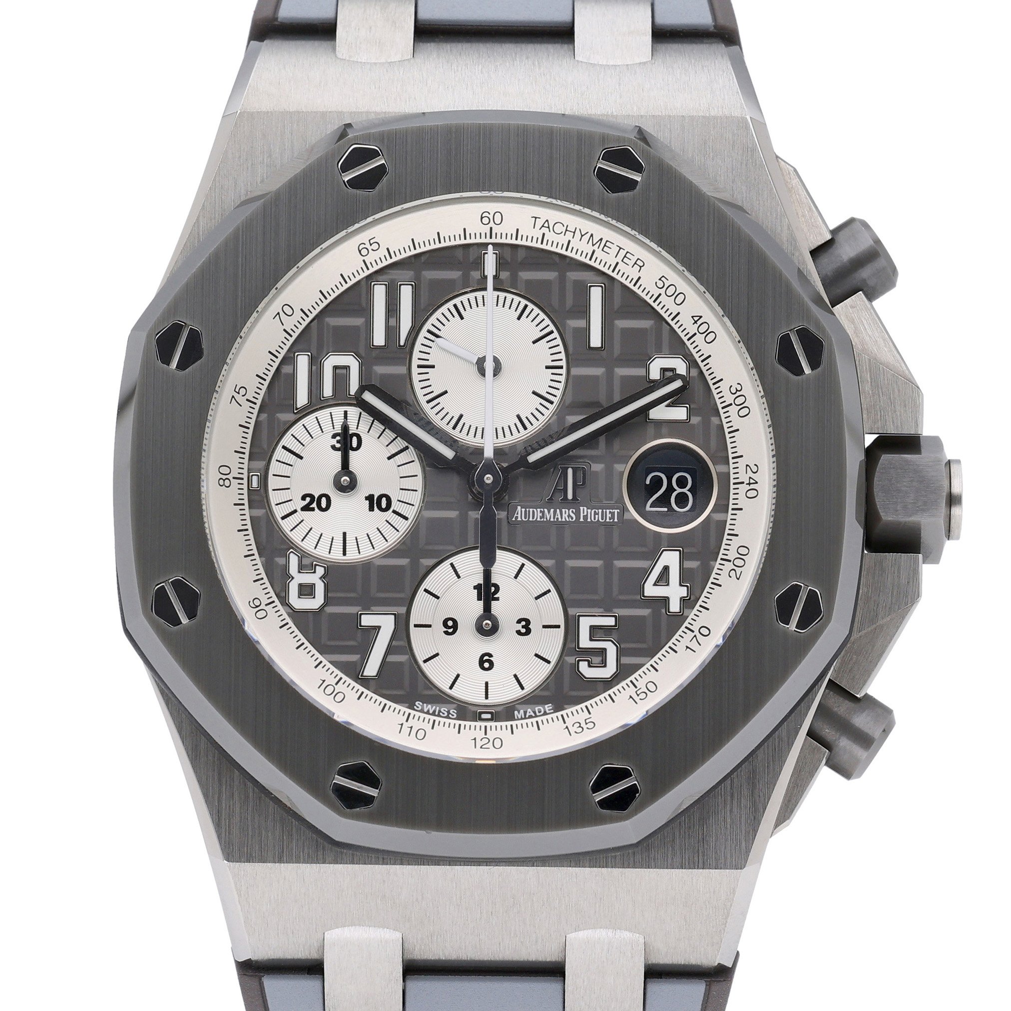 This Audemars Piguet Royal Oak Offshore 26470IO.OO.A006CA.01 has a grey arabic dial and a rubber strap. This Audemars Piguet has undergone a thorough inspection of accuracy, functionality and condition at our Audemars Piguet certified service centre to determine the level of reconditioning required to meet our strict standards. It has also been checked against our records to ensure authenticity. All our watches have a 24-month warranty for your peace of mind.