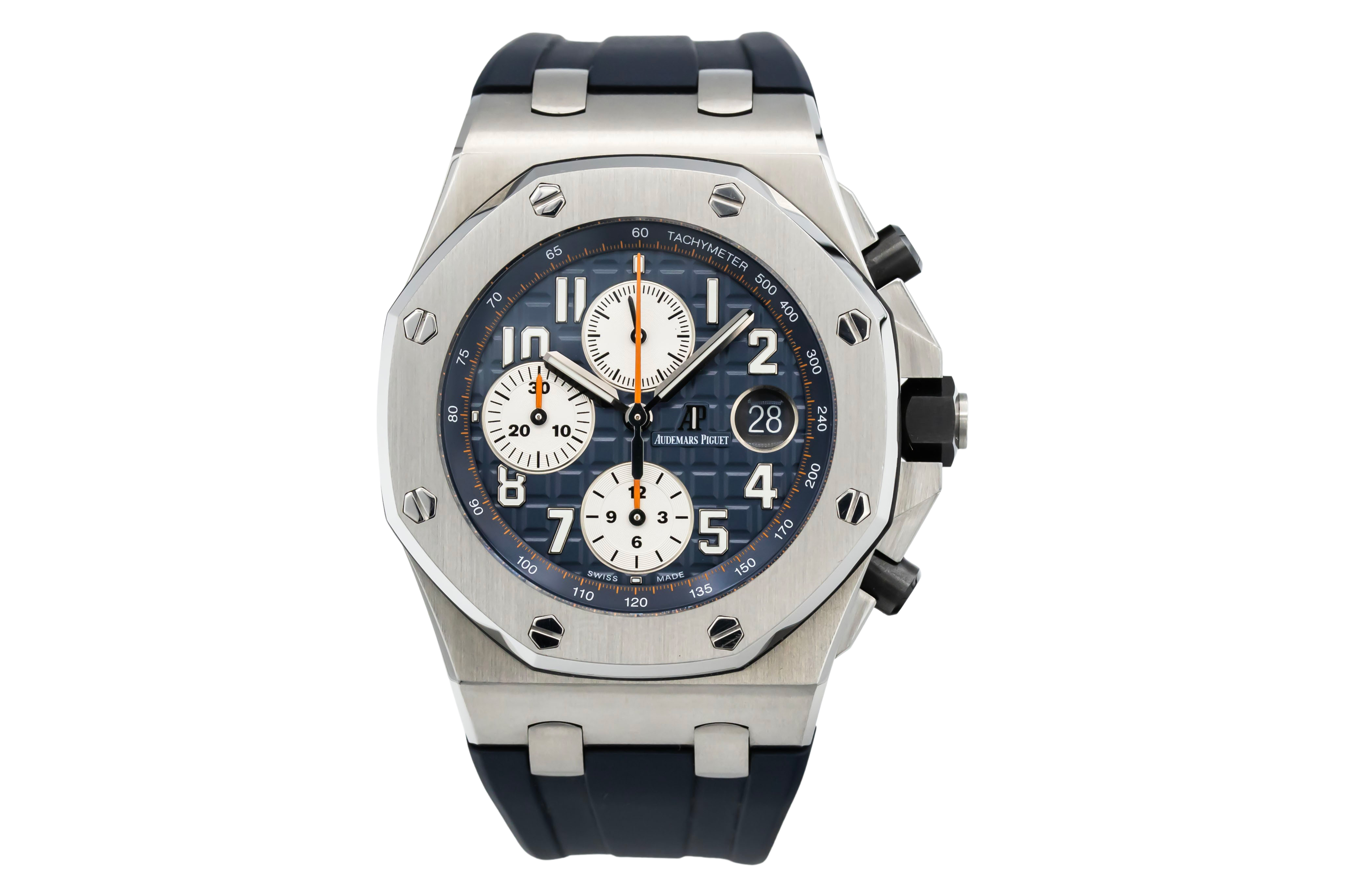This Audemars Piguet Royal Oak Offshore 26470ST.OO.A027CA.01 has a blue arabic dial and a rubber strap. This Audemars Piguet has undergone a thorough inspection of accuracy, functionality and condition at our Audemars Piguet certified service centre to determine the level of reconditioning required to meet our strict standards. It has also been checked against our records to ensure authenticity. All our watches have a 24-month warranty for your peace of mind.