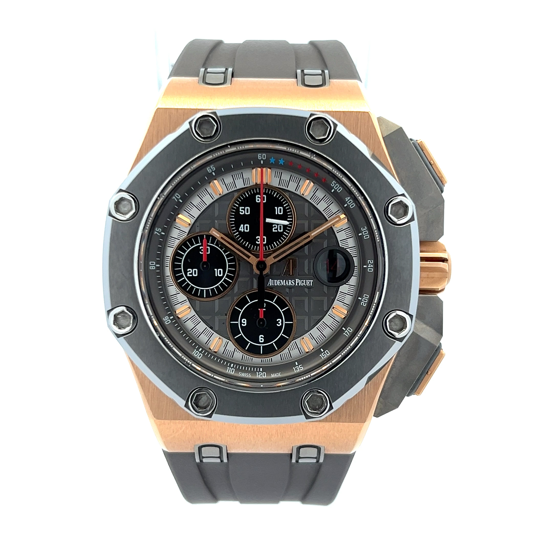 This Audemars Piguet Royal Oak Offshore 26568OM.OO.A004CA.01 has a grey baton dial and a rubber strap. This Audemars Piguet has undergone a thorough inspection of accuracy, functionality and condition at our Audemars Piguet certified service centre to determine the level of reconditioning required to meet our strict standards. It has also been checked against our records to ensure authenticity. All our watches have a 24-month warranty for your peace of mind.