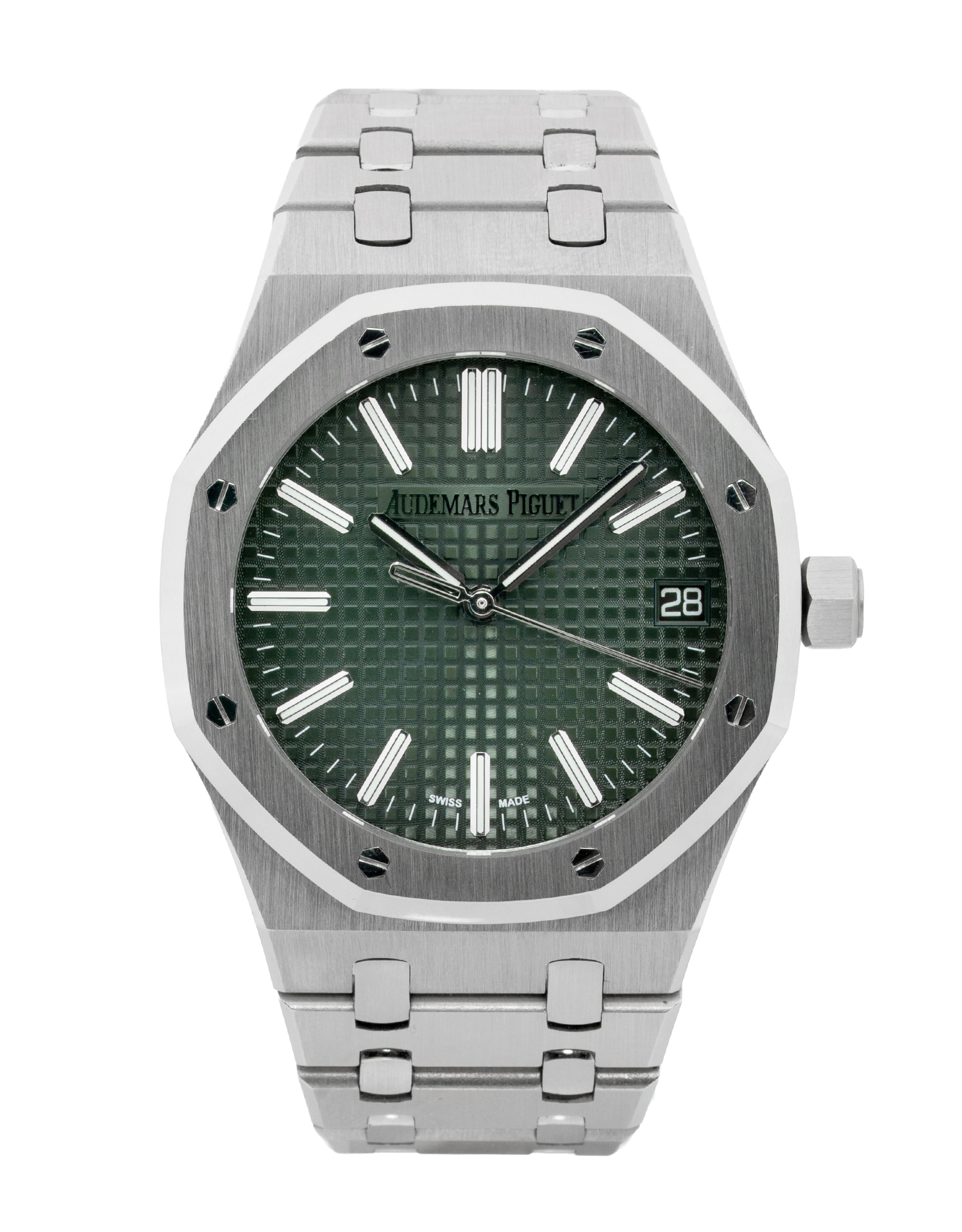This Audemars Piguet Royal Oak 15510ST.OO.1320ST.09 has a green baton dial and a bracelet strap. This Audemars Piguet has undergone a thorough inspection of accuracy, functionality and condition at our Audemars Piguet certified service centre to determine the level of reconditioning required to meet our strict standards. It has also been checked against our records to ensure authenticity. All our watches have a 24-month warranty for your peace of mind.