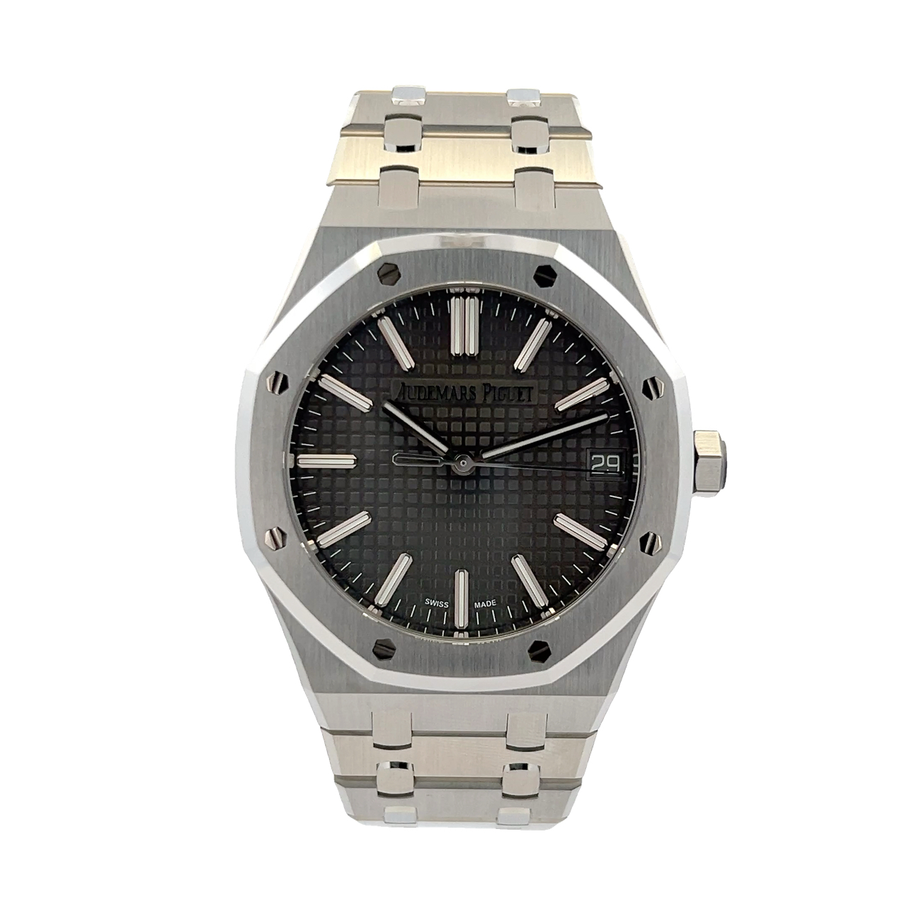 This Audemars Piguet Royal Oak 15510ST.OO.1320ST.10 has a grey baton dial and a bracelet strap. This Audemars Piguet has undergone a thorough inspection of accuracy, functionality and condition at our Audemars Piguet certified service centre to determine the level of reconditioning required to meet our strict standards. It has also been checked against our records to ensure authenticity. Our watches have a 24-month warranty for your peace of mind, in conjunction with any remaining manufacturer’s warranty from new or from service.