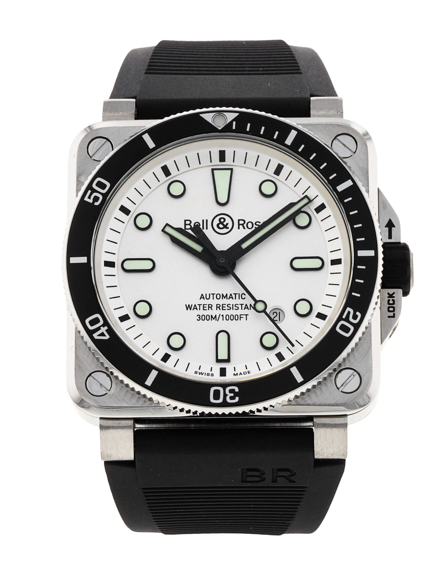This Bell and Ross BR03-92 BR0392-D-WH-ST/SRB has a white dial and a rubber strap. This Bell and Ross has undergone a thorough inspection of water resistance, accuracy, functionality and condition to determine the level of reconditioning required to meet our strict standards. It has also been referenced against technical documents and manufacturer records where available to ensure authenticity and a clean history. All our watches have a 24-month warranty for your peace of mind.