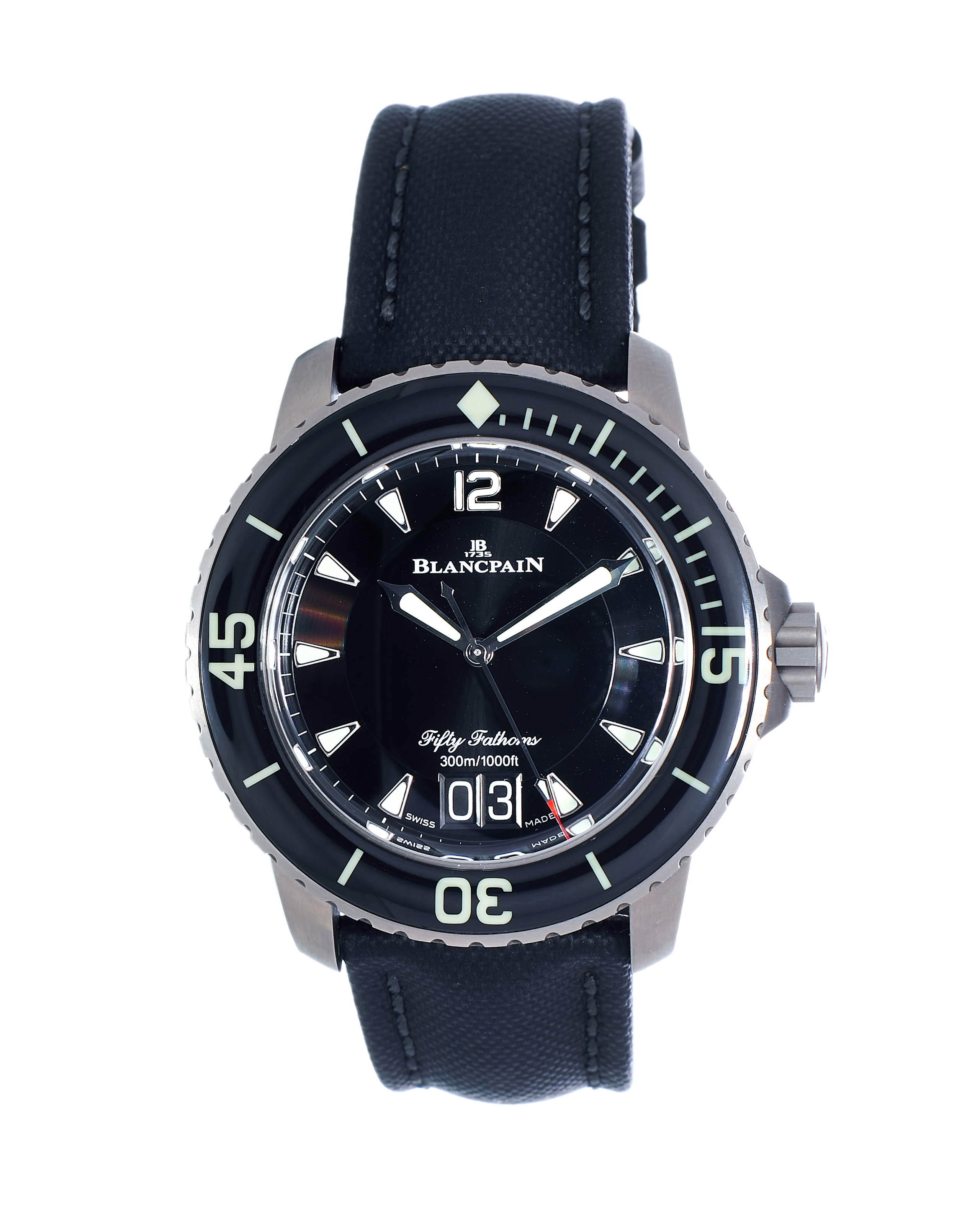 This Blancpain Fifty Fathoms 5050-12B30-B52A has a black dial and a fabric strap. This Blancpain has undergone a thorough inspection of water resistance, accuracy, functionality and condition to determine the level of reconditioning required to meet our strict standards. It has also been referenced against technical documents and manufacturer records where available to ensure authenticity and a clean history. All our watches have a 24-month warranty for your peace of mind.