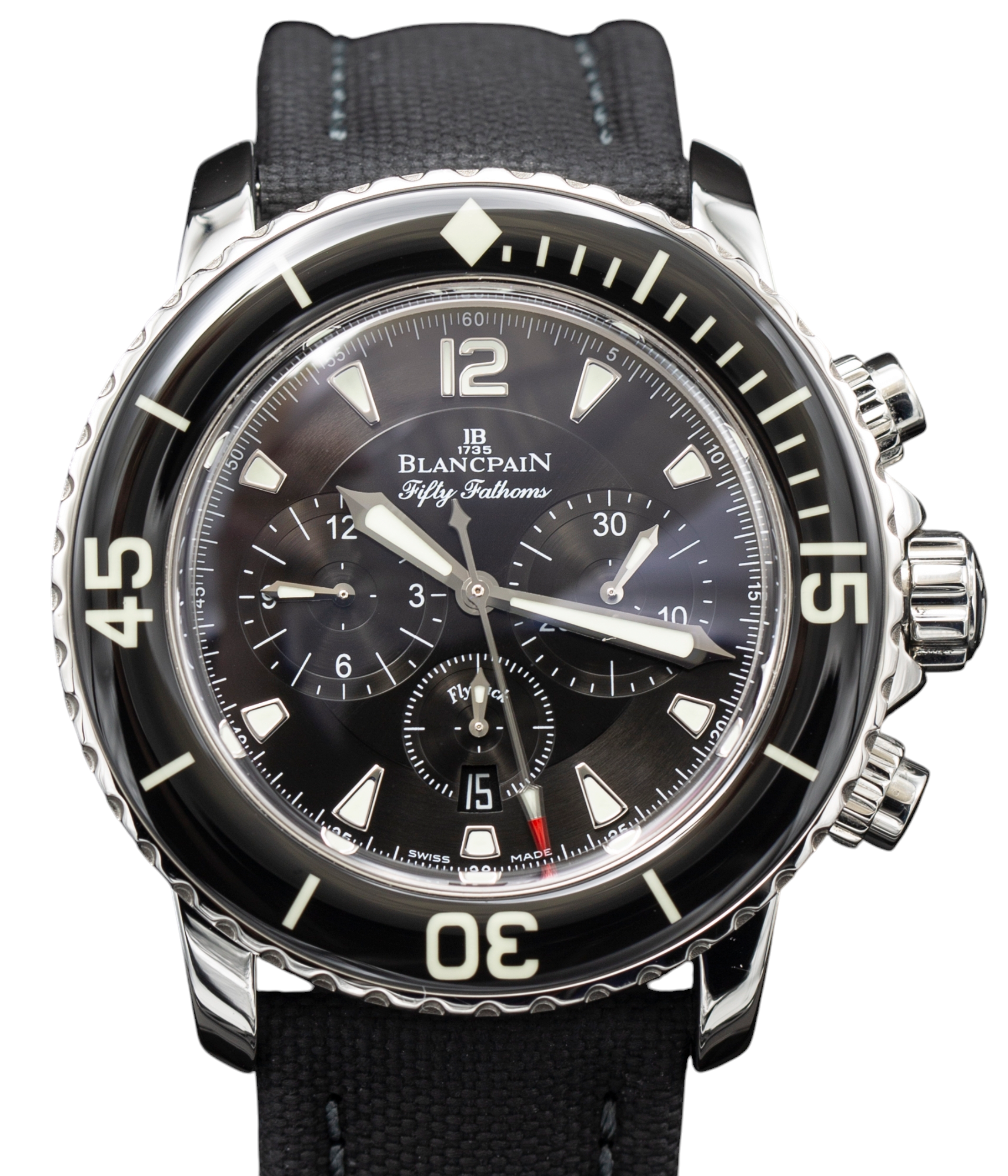 This Blancpain Fifty Fathoms 5085F-1130-52 has a black baton dial and a fabric strap. This Blancpain has undergone a thorough inspection of water resistance, accuracy, functionality and condition to determine the level of reconditioning required to meet our strict standards. It has also been referenced against technical documents and manufacturer records where available to ensure authenticity and a clean history. All our watches have a 24-month warranty for your peace of mind.