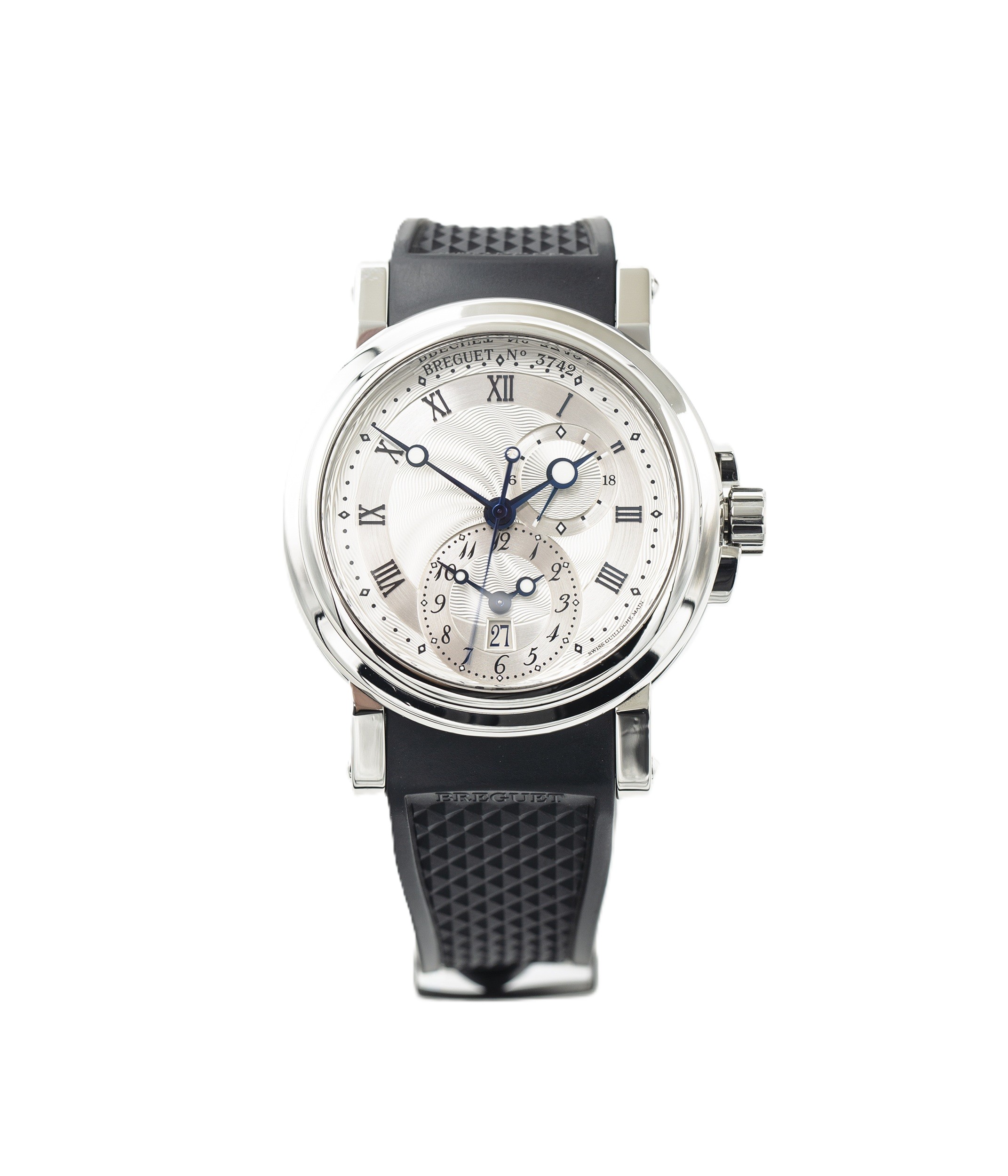 This Breguet Marine 5857ST/12/5ZU has a silver roman numeral dial and a rubber strap. This Breguet has undergone a thorough inspection of water resistance, accuracy, functionality and condition to determine the level of reconditioning required to meet our strict standards. It has also been referenced against technical documents and manufacturer records where available to ensure authenticity and a clean history. All our watches have a 24-month warranty for your peace of mind.