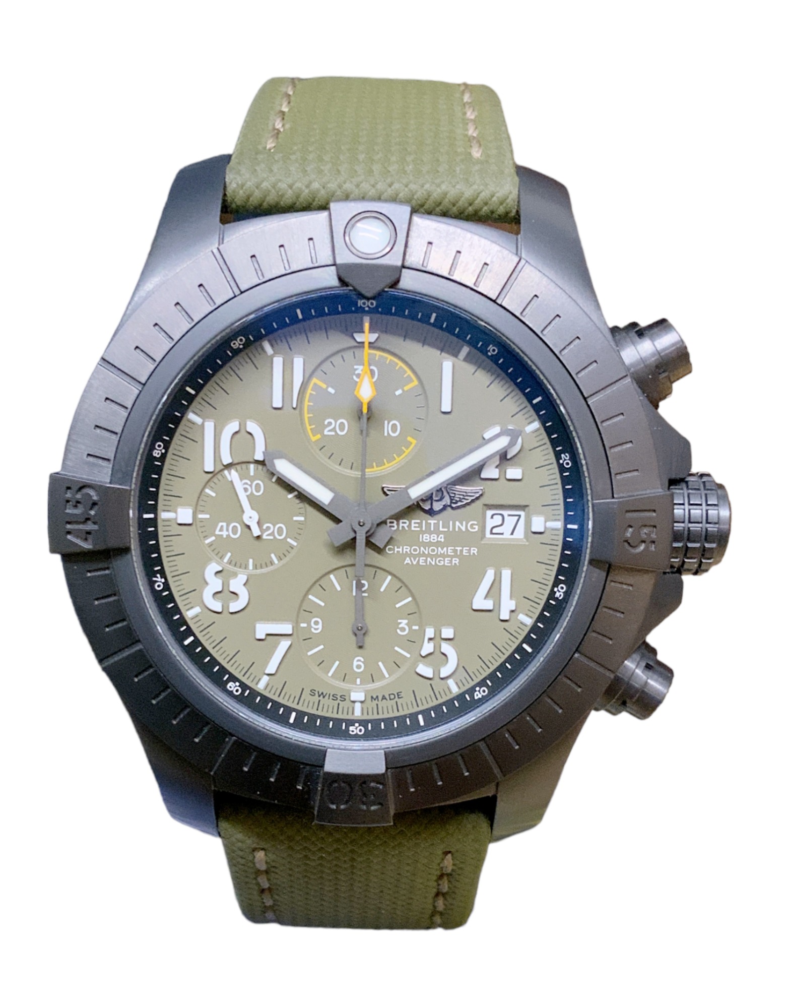 This Breitling Avenger Chronograph 45 Night Mission V13317 has a green arabic dial and a fabric strap. This Breitling has undergone a thorough inspection of water resistance, accuracy, functionality and condition to determine the level of reconditioning required to meet our strict standards. It has also been referenced against technical documents and manufacturer records where available to ensure authenticity and a clean history. All our watches have a 24-month warranty for your peace of mind.