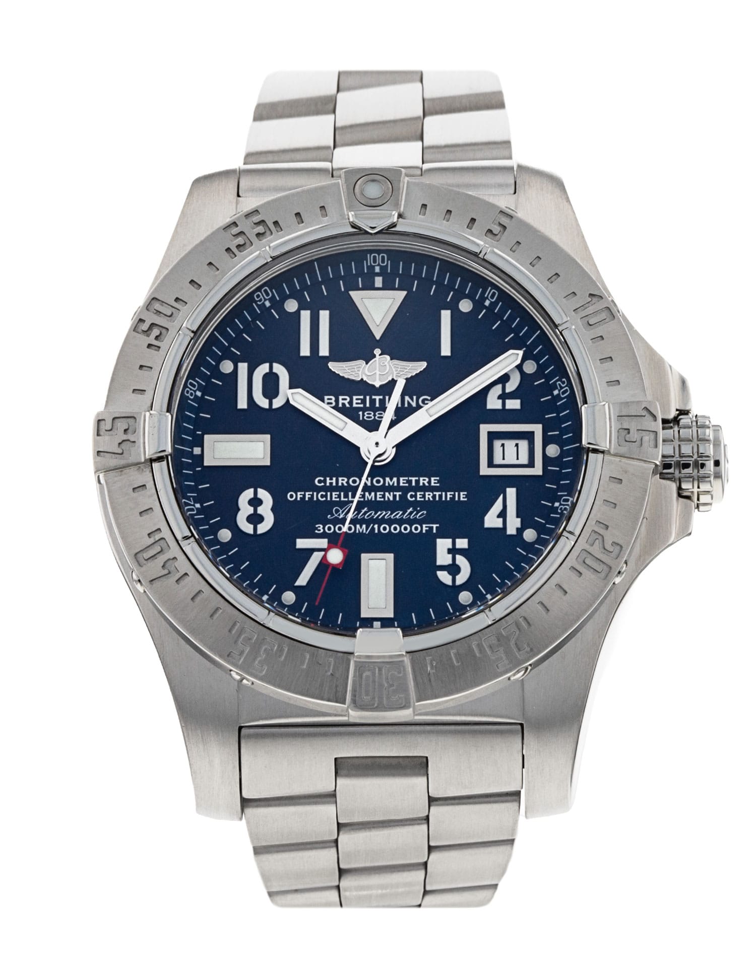 This Breitling Avenger Seawolf A17330 has a blue arabic dial and a bracelet strap. This Breitling has undergone a thorough inspection of water resistance, accuracy, functionality and condition to determine the level of reconditioning required to meet our strict standards. It has also been referenced against technical documents and manufacturer records where available to ensure authenticity and a clean history. All our watches have a 24-month warranty for your peace of mind.