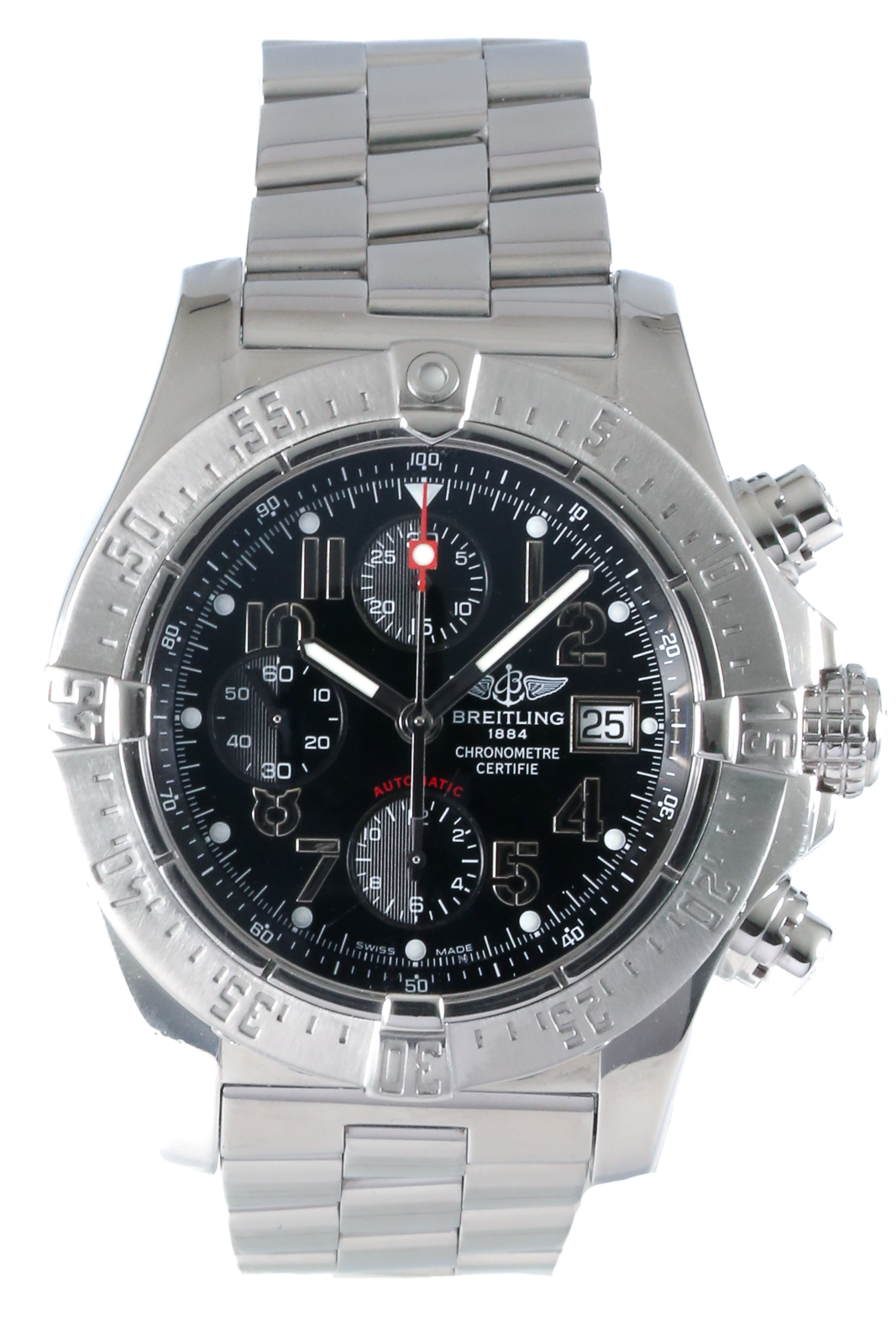 This Breitling Avenger Skyland A13380 has a black arabic dial and a bracelet strap. This Breitling has undergone a thorough inspection of water resistance, accuracy, functionality and condition to determine the level of reconditioning required to meet our strict standards. It has also been referenced against technical documents and manufacturer records where available to ensure authenticity and a clean history. All our watches have a 24-month warranty for your peace of mind.