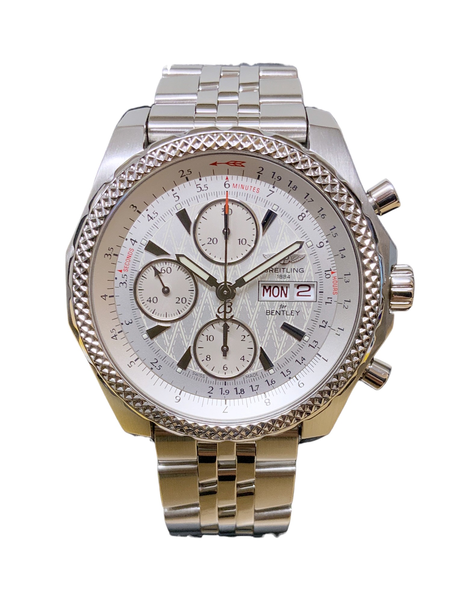 This Breitling Bentley GT A13363 has a silver baton dial and a bracelet strap. This Breitling has undergone a thorough inspection of water resistance, accuracy, functionality and condition to determine the level of reconditioning required to meet our strict standards. It has also been referenced against technical documents and manufacturer records where available to ensure authenticity and a clean history. All our watches have a 24-month warranty for your peace of mind.