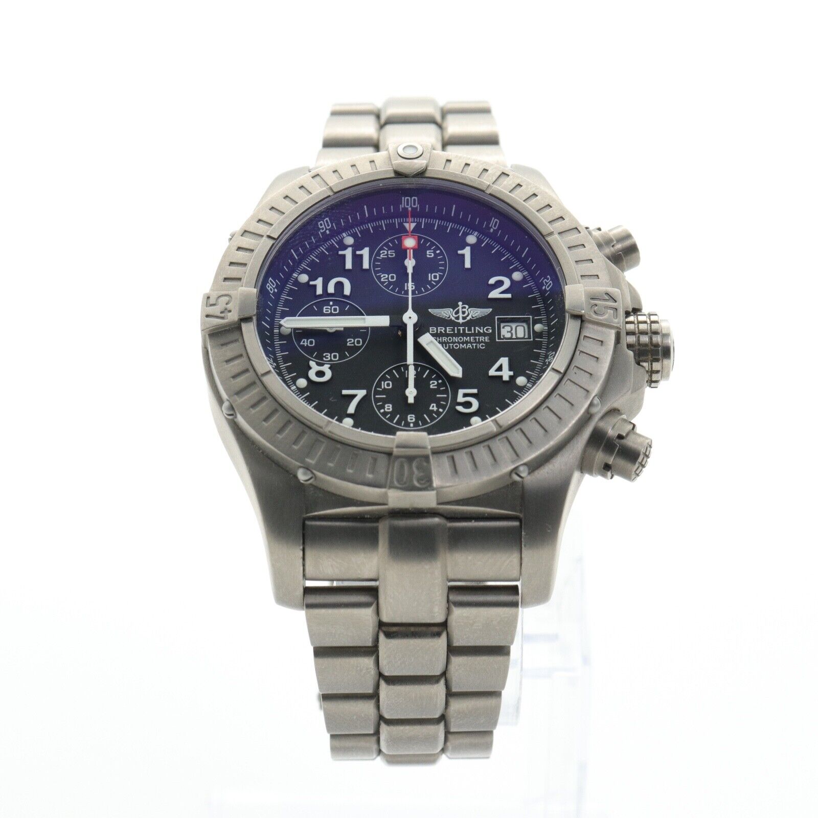 This Breitling Chrono Avenger E13360 has a black arabic dial and a bracelet strap. This Breitling has undergone a thorough inspection of water resistance, accuracy, functionality and condition to determine the level of reconditioning required to meet our strict standards. It has also been referenced against technical documents and manufacturer records where available to ensure authenticity and a clean history. All our watches have a 24-month warranty for your peace of mind.