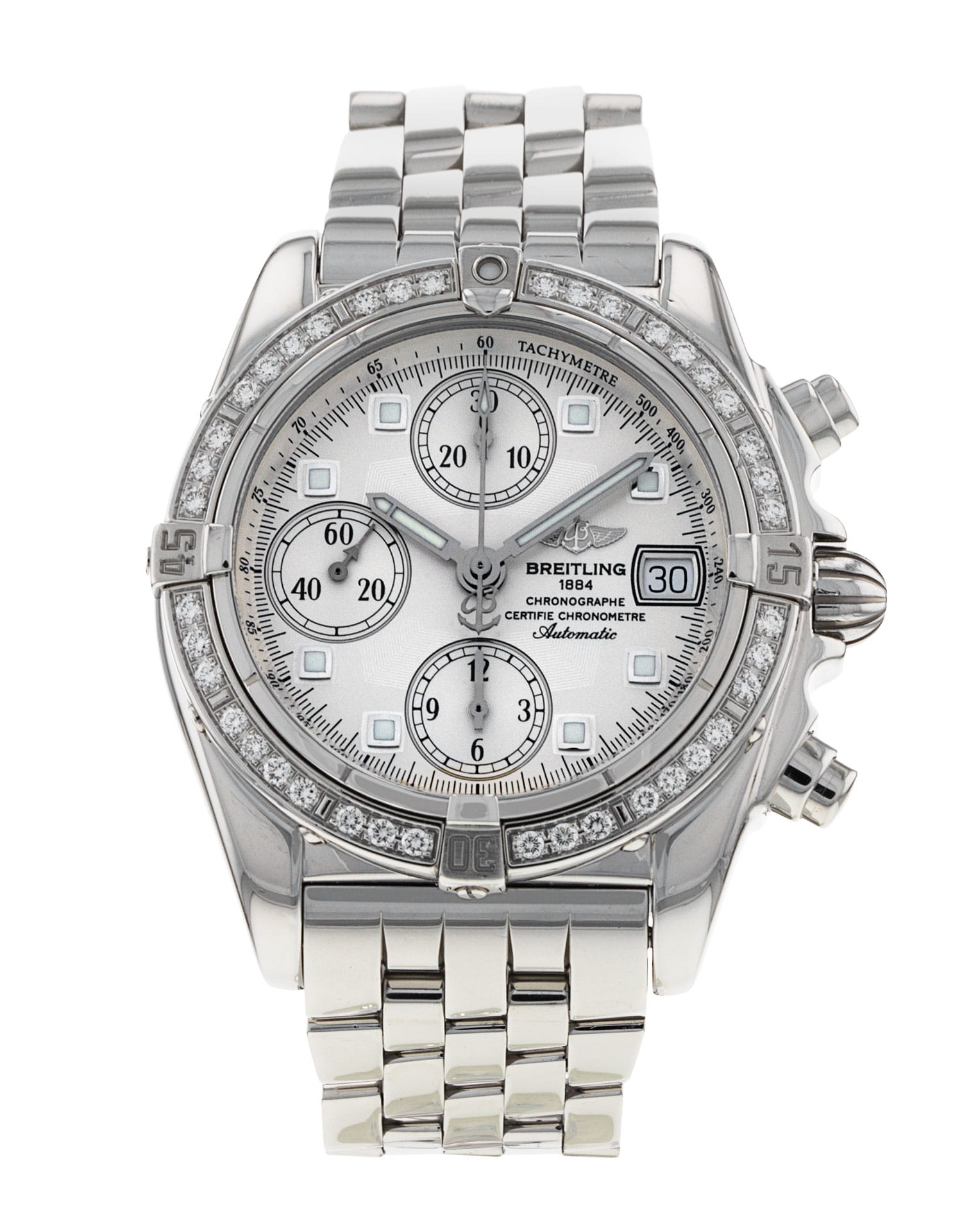 This Breitling Chrono Cockpit A13357 has a mother of pearl white dial and a bracelet strap. This Breitling has undergone a thorough inspection of water resistance, accuracy, functionality and condition to determine the level of reconditioning required to meet our strict standards. It has also been referenced against technical documents and manufacturer records where available to ensure authenticity and a clean history. Our watches have a 24-month warranty for your peace of mind, in conjunction with any remaining manufacturer’s warranty from new or from service.