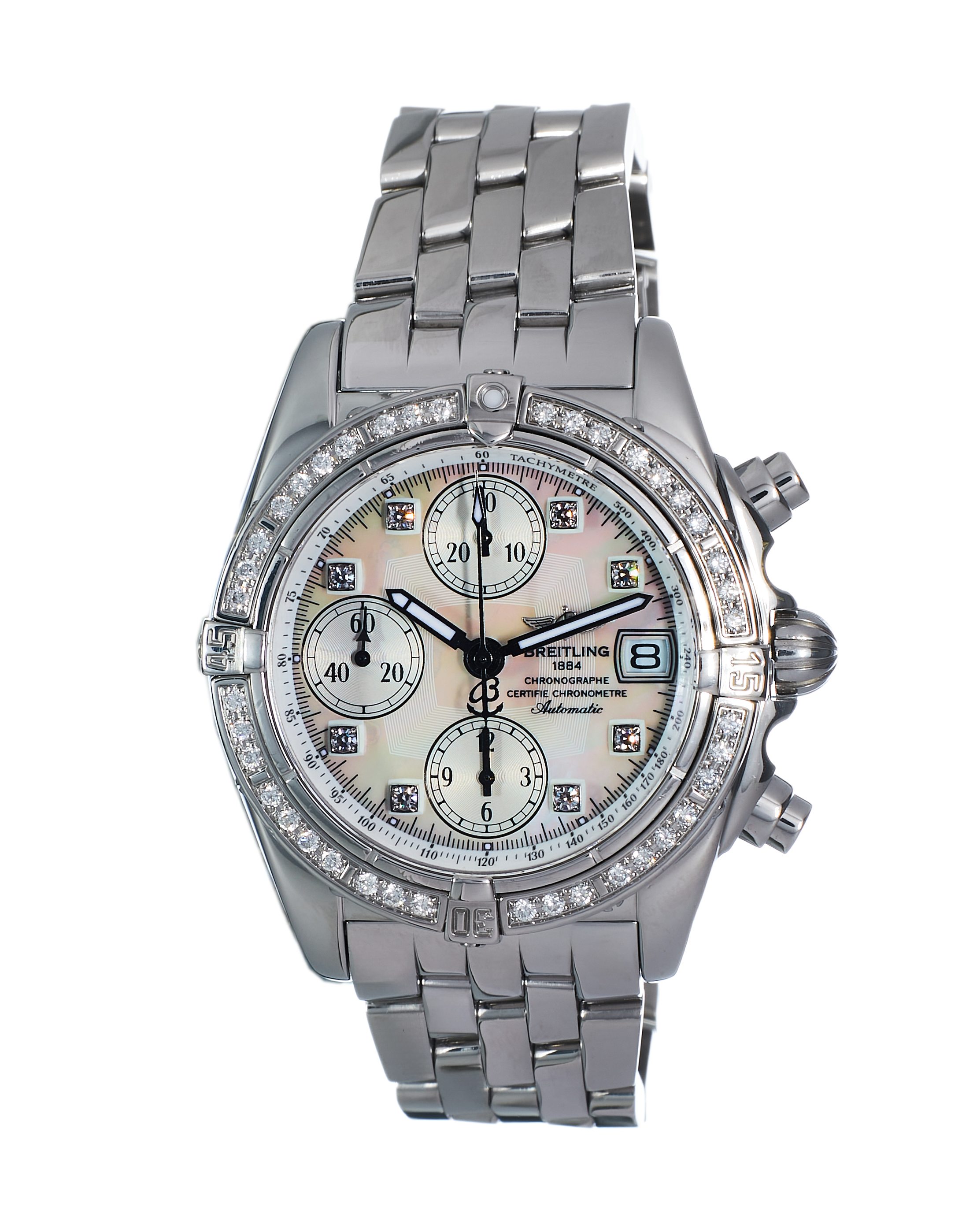 This Breitling Chrono Cockpit A13357 has a mother of pearl white - diamond dial and a bracelet strap. This Breitling has undergone a thorough inspection of water resistance, accuracy, functionality and condition to determine the level of reconditioning required to meet our strict standards. It has also been referenced against technical documents and manufacturer records where available to ensure authenticity and a clean history. All our watches have a 24-month warranty for your peace of mind.