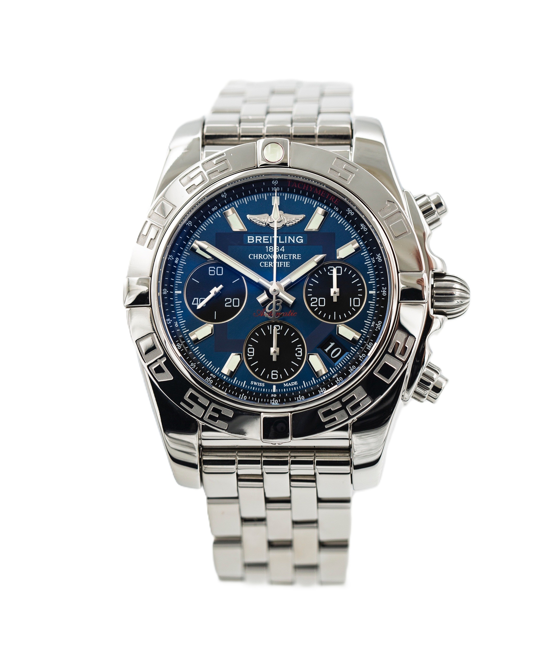 This Breitling Chronomat 41 AB0140 has a blue baton dial and a bracelet strap. This Breitling has undergone a thorough inspection of water resistance, accuracy, functionality and condition to determine the level of reconditioning required to meet our strict standards. It has also been referenced against technical documents and manufacturer records where available to ensure authenticity and a clean history. All our watches have a 24-month warranty for your peace of mind.