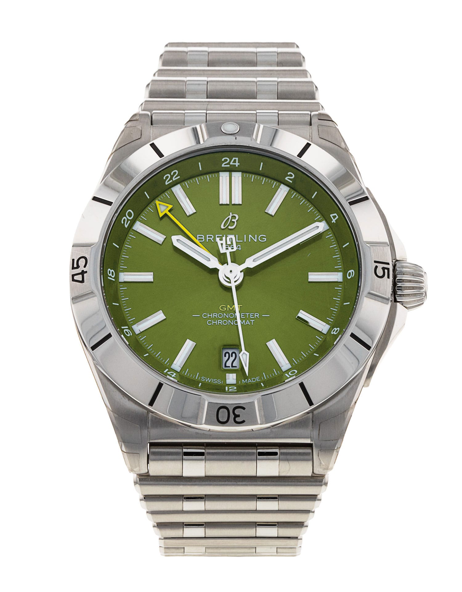 This Breitling Chronomat Automatic GMT 40 A32398 has a green baton dial and a bracelet strap. This Breitling has undergone a thorough inspection of water resistance, accuracy, functionality and condition to determine the level of reconditioning required to meet our strict standards. It has also been referenced against technical documents and manufacturer records where available to ensure authenticity and a clean history. Our watches have a 24-month warranty for your peace of mind, in conjunction with any remaining manufacturer’s warranty from new or from service.