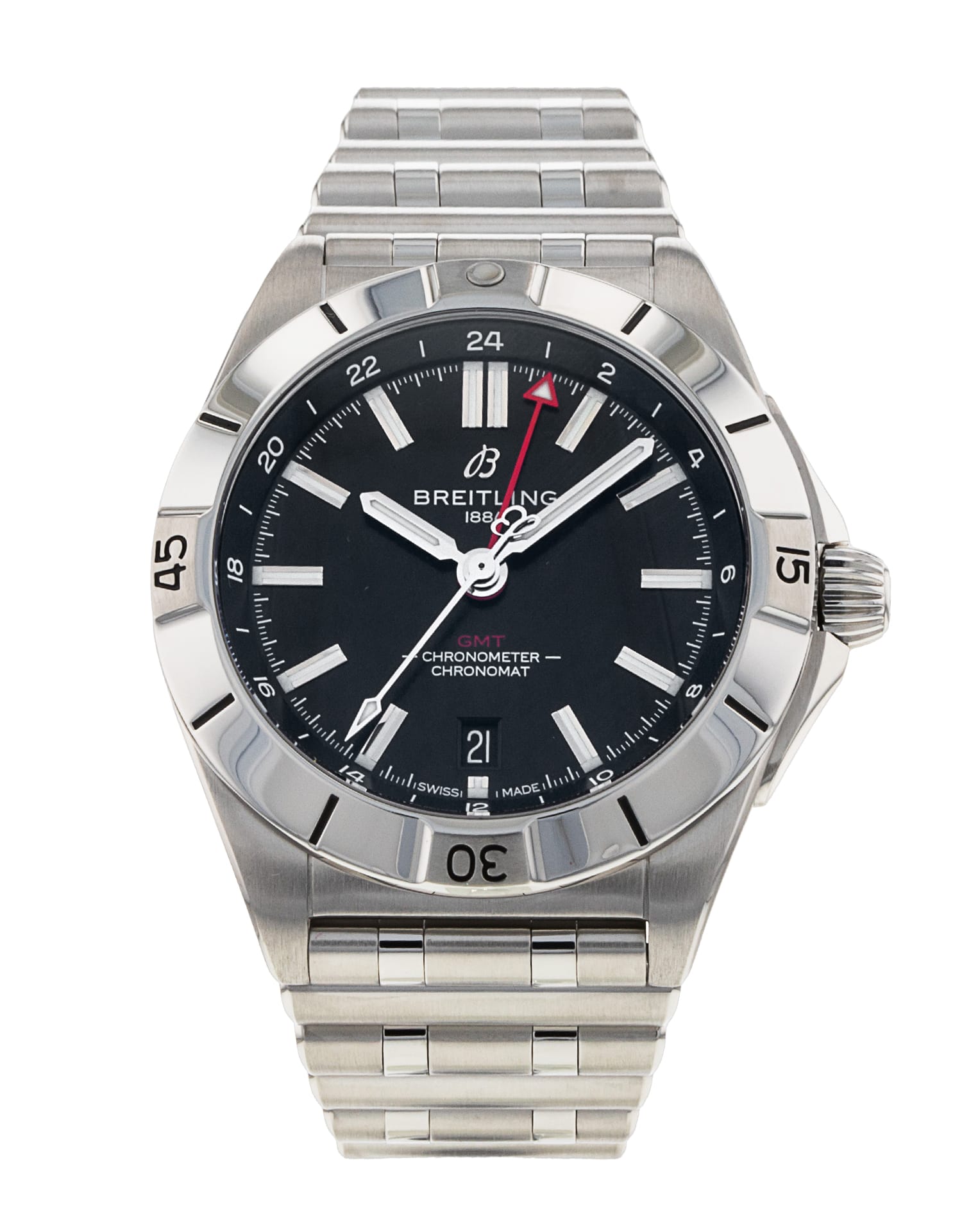 This Breitling Chronomat Automatic GMT 40 A32398 has a black baton dial and a bracelet strap. This Breitling has undergone a thorough inspection of water resistance, accuracy, functionality and condition to determine the level of reconditioning required to meet our strict standards. It has also been referenced against technical documents and manufacturer records where available to ensure authenticity and a clean history. Our watches have a 24-month warranty for your peace of mind, in conjunction with any remaining manufacturer’s warranty from new or from service.