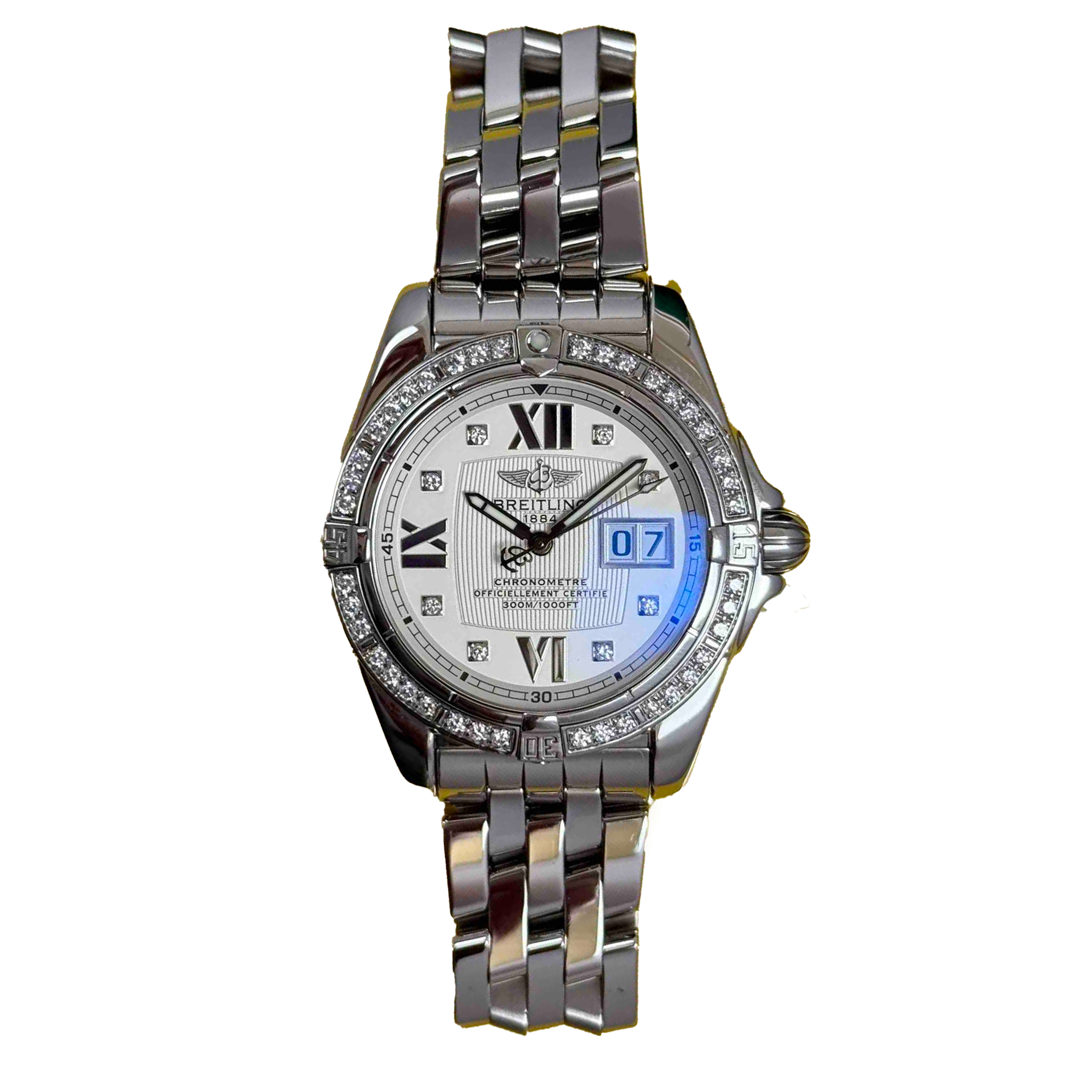 This Breitling Cockpit Gents A49350 has a silver quarter roman numeral dial and a bracelet strap. This Breitling has undergone a thorough inspection of water resistance, accuracy, functionality and condition to determine the level of reconditioning required to meet our strict standards. It has also been referenced against technical documents and manufacturer records where available to ensure authenticity and a clean history. All our watches have a 24-month warranty for your peace of mind.