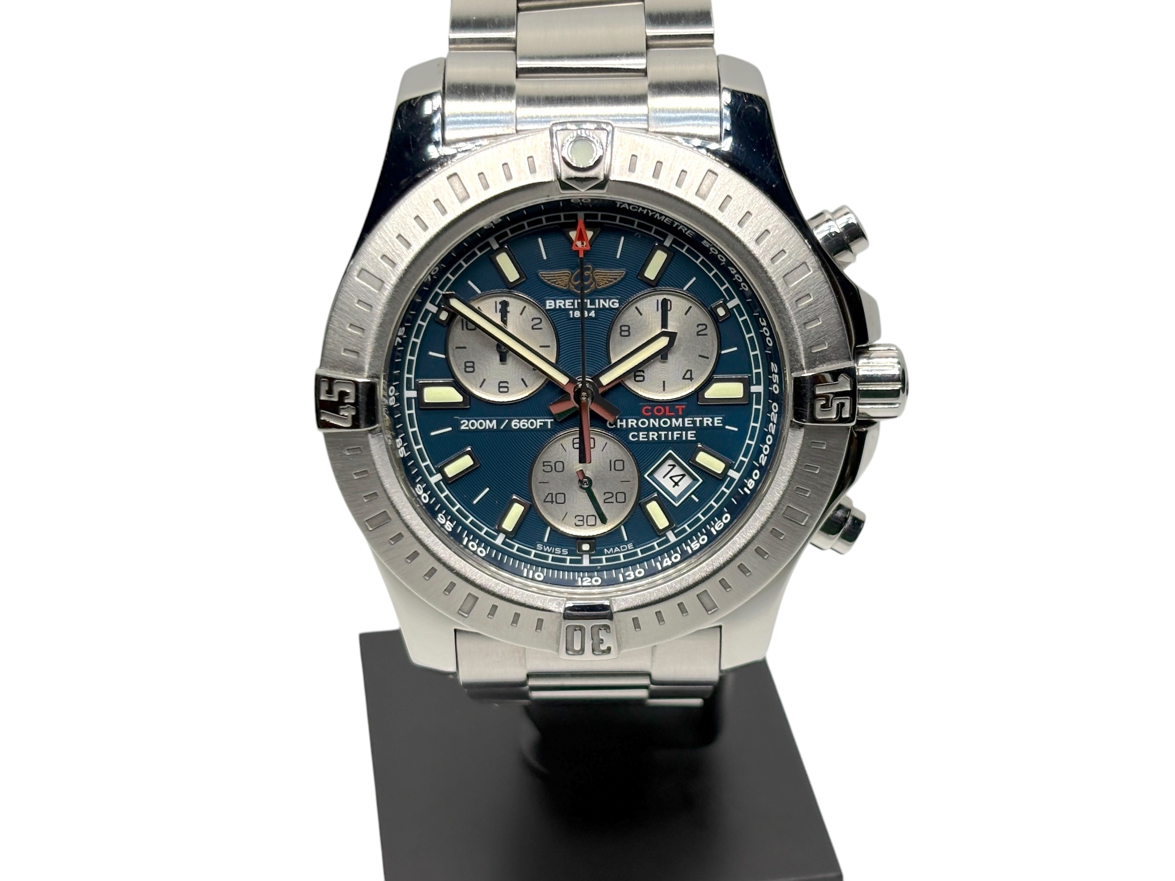 This Breitling Colt Chronograph II A73388 has a white baton dial and a bracelet strap. This Breitling has undergone a thorough inspection of water resistance, accuracy, functionality and condition to determine the level of reconditioning required to meet our strict standards. It has also been referenced against technical documents and manufacturer records where available to ensure authenticity and a clean history. All our watches have a 24-month warranty for your peace of mind.