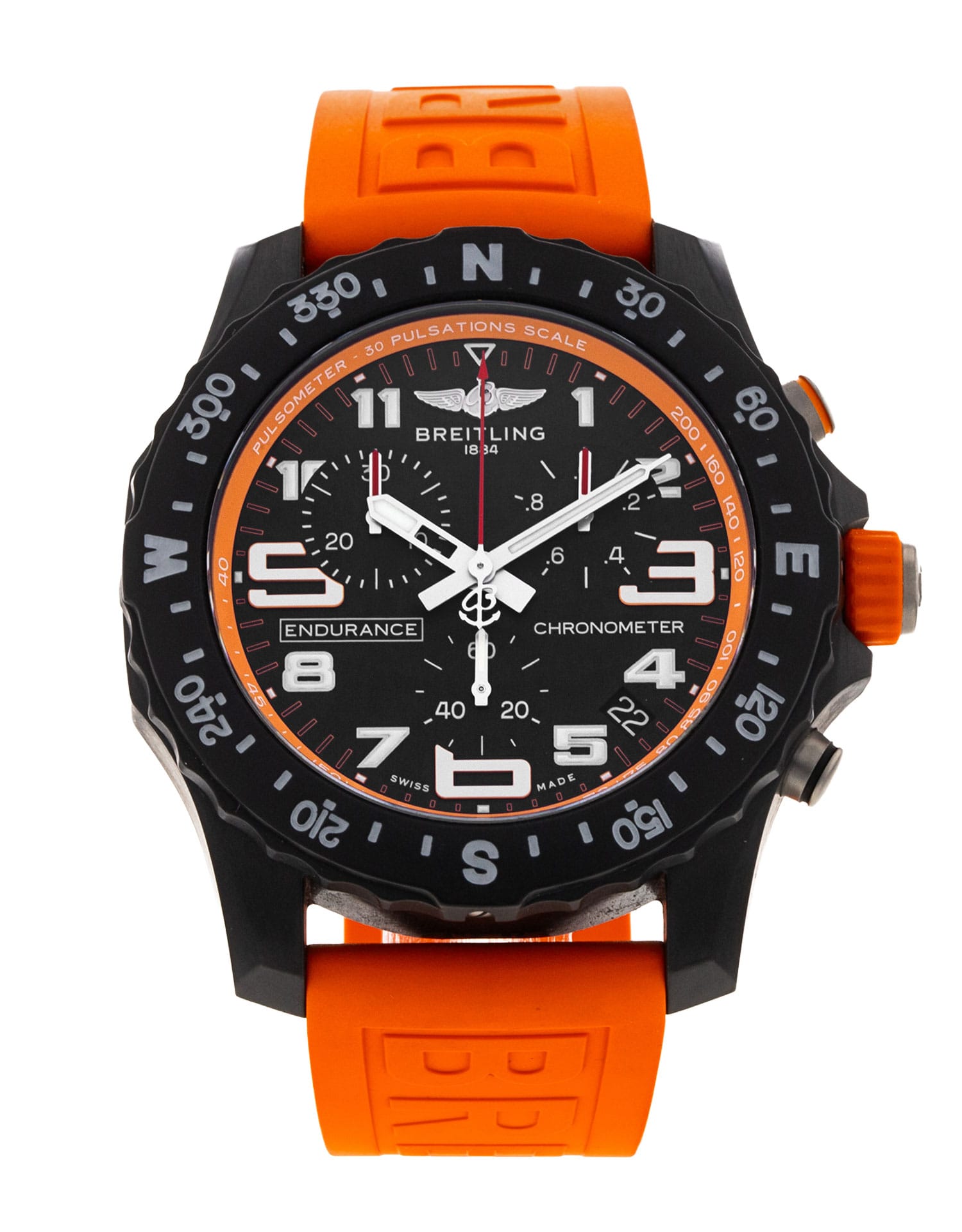 This Breitling Endurance Pro X82310 has a black arabic dial and a rubber strap. This Breitling has undergone a thorough inspection of water resistance, accuracy, functionality and condition to determine the level of reconditioning required to meet our strict standards. It has also been referenced against technical documents and manufacturer records where available to ensure authenticity and a clean history. All our watches have a 24-month warranty for your peace of mind.