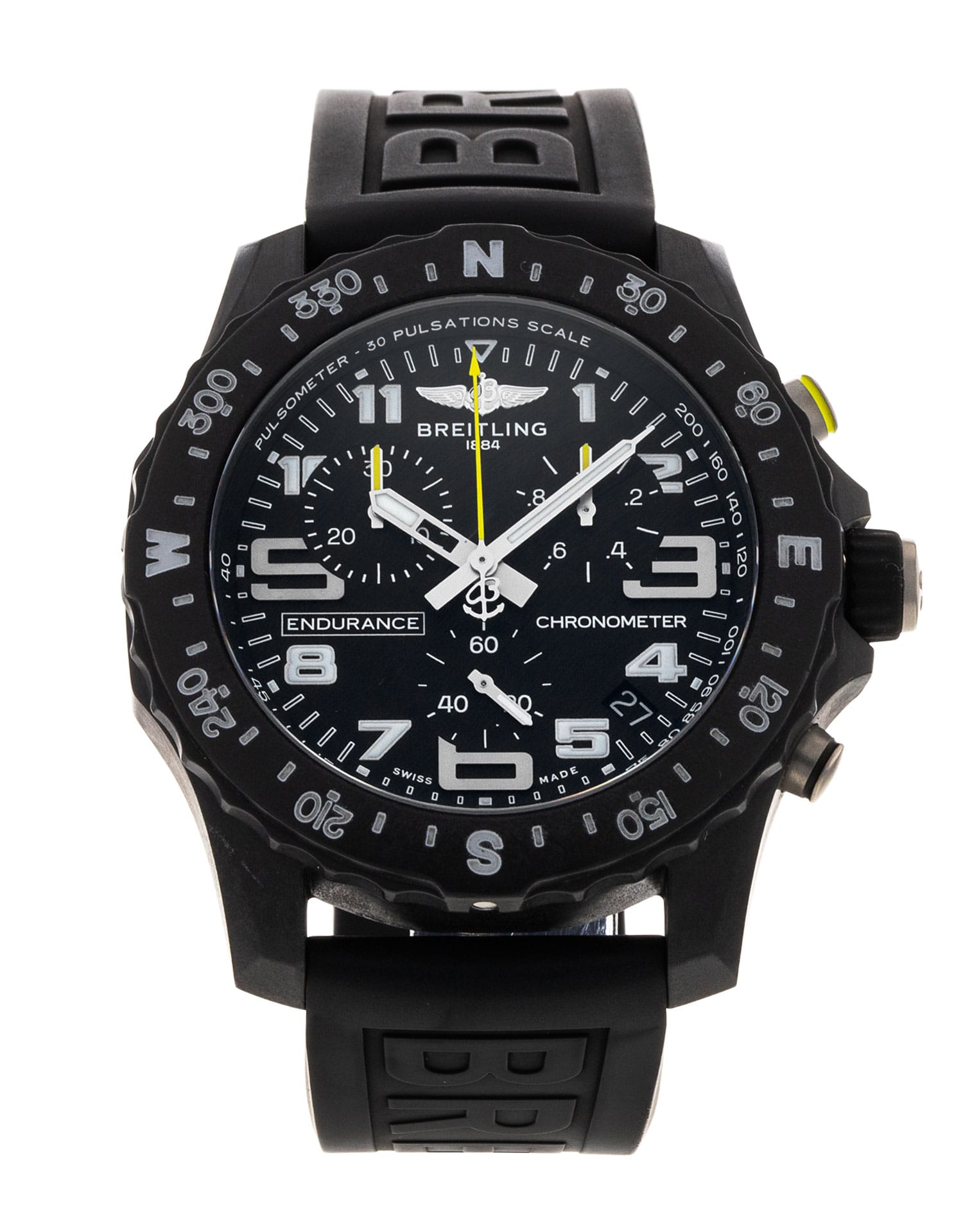 This Breitling Endurance Pro X82310 has a black arabic dial and a rubber strap. This Breitling has undergone a thorough inspection of water resistance, accuracy, functionality and condition to determine the level of reconditioning required to meet our strict standards. It has also been referenced against technical documents and manufacturer records where available to ensure authenticity and a clean history. All our watches have a 24-month warranty for your peace of mind.