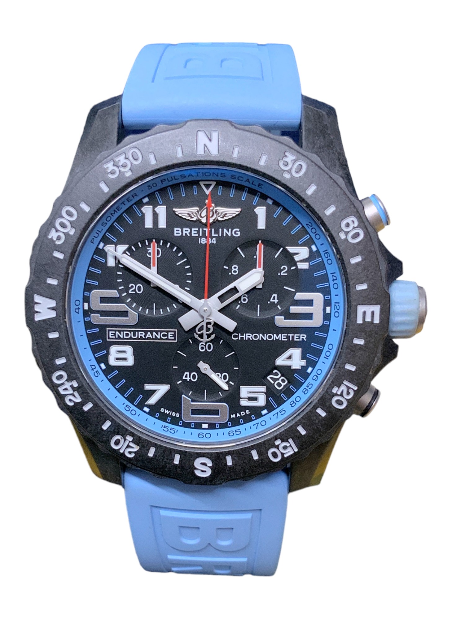 This Breitling Endurance Pro X82310 has a black arabic dial and a rubber strap. This Breitling has undergone a thorough inspection of water resistance, accuracy, functionality and condition to determine the level of reconditioning required to meet our strict standards. It has also been referenced against technical documents and manufacturer records where available to ensure authenticity and a clean history. All our watches have a 24-month warranty for your peace of mind.