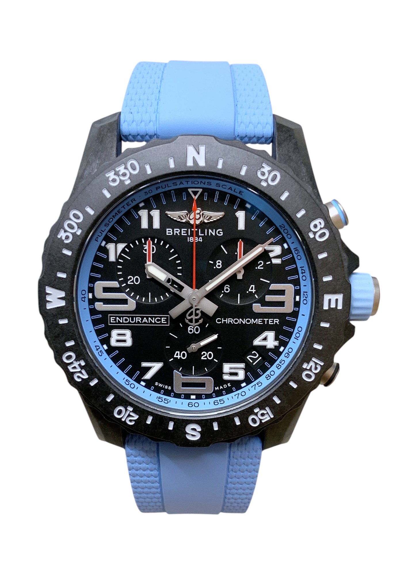 This Breitling Endurance Pro X82310 has a black arabic dial and a rubber strap. This Breitling has undergone a thorough inspection of water resistance, accuracy, functionality and condition to determine the level of reconditioning required to meet our strict standards. It has also been referenced against technical documents and manufacturer records where available to ensure authenticity and a clean history. Our watches have a 24-month warranty for your peace of mind, in conjunction with any remaining manufacturer’s warranty from new or from service.