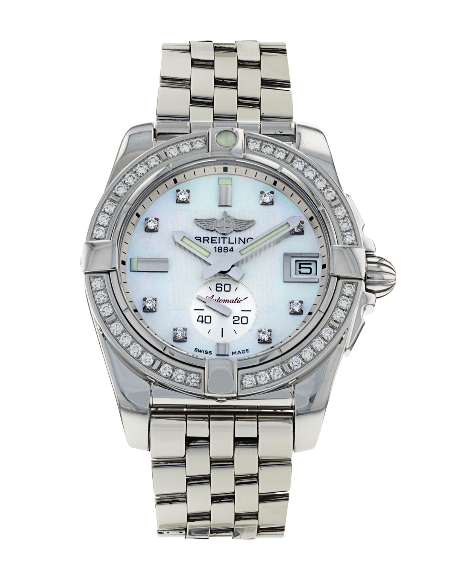 This Breitling Galactic 36 Automatic A37330 has a mother of pearl white - diamond dial and a bracelet strap. This Breitling has undergone a thorough inspection of water resistance, accuracy, functionality and condition to determine the level of reconditioning required to meet our strict standards. It has also been referenced against technical documents and manufacturer records where available to ensure authenticity and a clean history. Our watches have a 24-month warranty for your peace of mind, in conjunction with any remaining manufacturer’s warranty from new or from service.