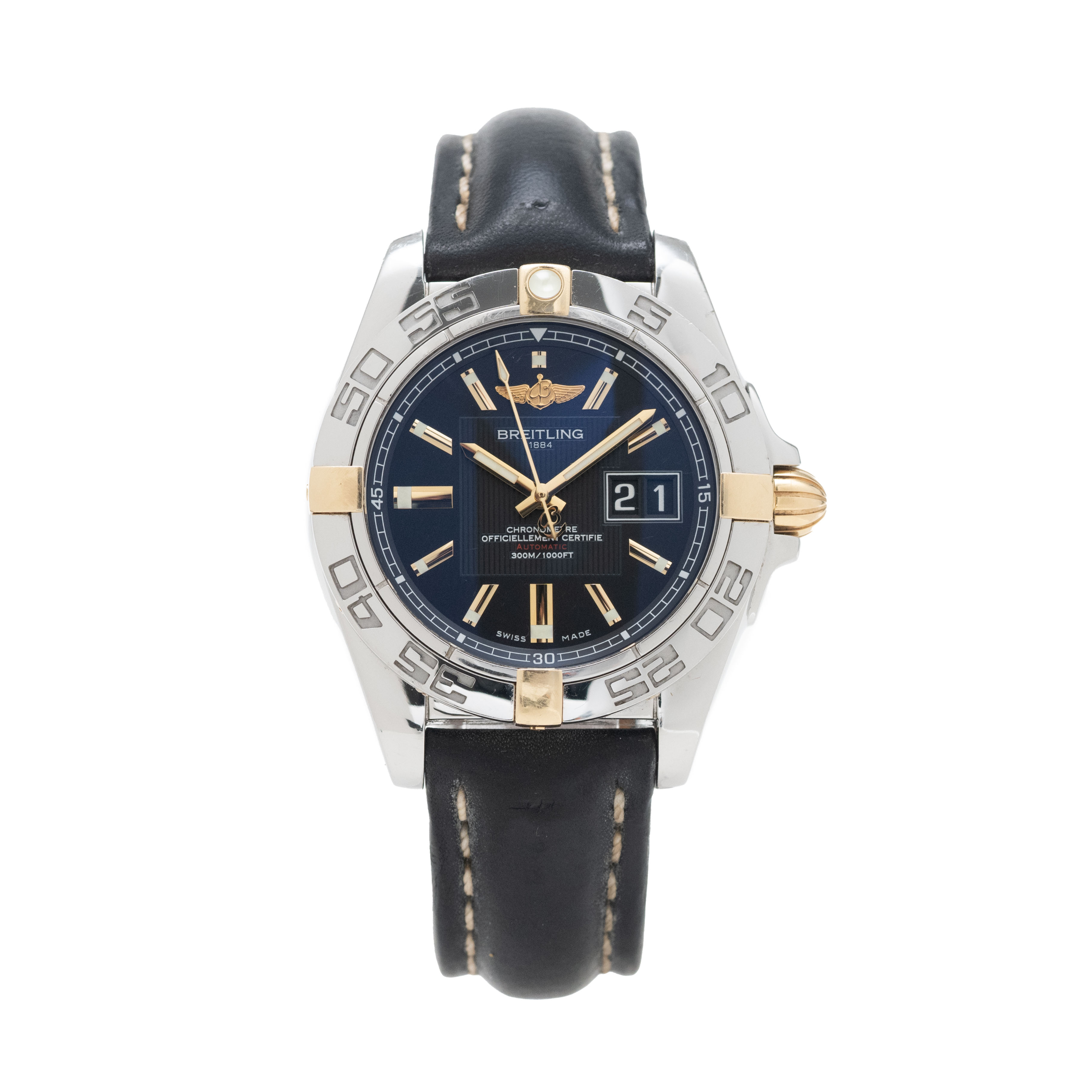 This Breitling Galactic 41 B49350L has a black baton dial and a leather strap. This Breitling has undergone a thorough inspection of water resistance, accuracy, functionality and condition to determine the level of reconditioning required to meet our strict standards. It has also been referenced against technical documents and manufacturer records where available to ensure authenticity and a clean history. All our watches have a 24-month warranty for your peace of mind.