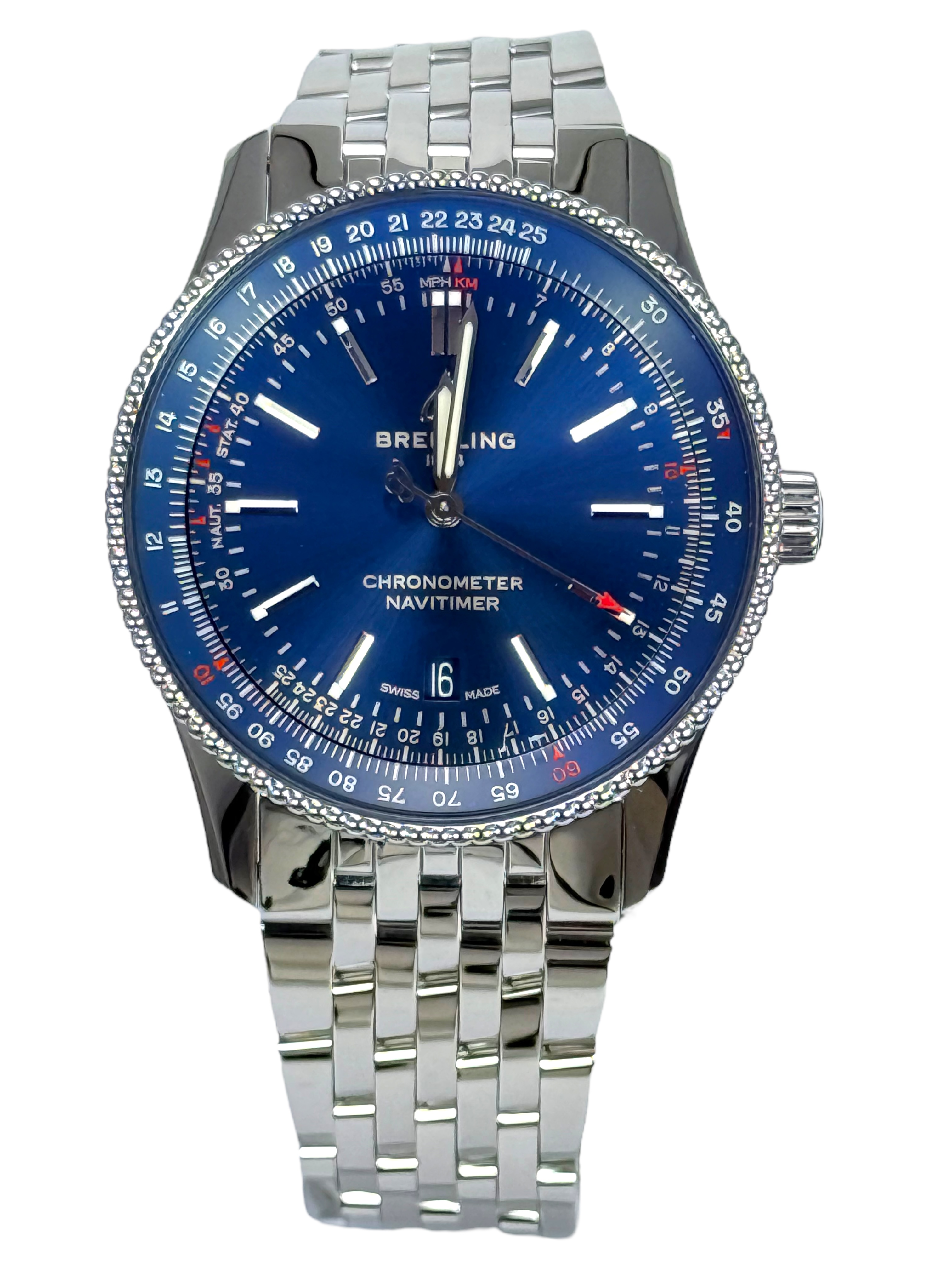 This Breitling Navitimer Automatic 41 A17326 has a blue baton dial and a bracelet strap. This Breitling has undergone a thorough inspection of water resistance, accuracy, functionality and condition to determine the level of reconditioning required to meet our strict standards. It has also been referenced against technical documents and manufacturer records where available to ensure authenticity and a clean history. All our watches have a 24-month warranty for your peace of mind.