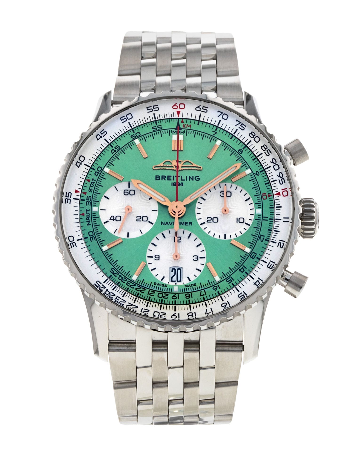 This Breitling Navitimer B01 Chronograph 41 AB0139 has a green baton dial and a bracelet strap. This Breitling has undergone a thorough inspection of water resistance, accuracy, functionality and condition to determine the level of reconditioning required to meet our strict standards. It has also been referenced against technical documents and manufacturer records where available to ensure authenticity and a clean history. Our watches have a 24-month warranty for your peace of mind, in conjunction with any remaining manufacturer’s warranty from new or from service.