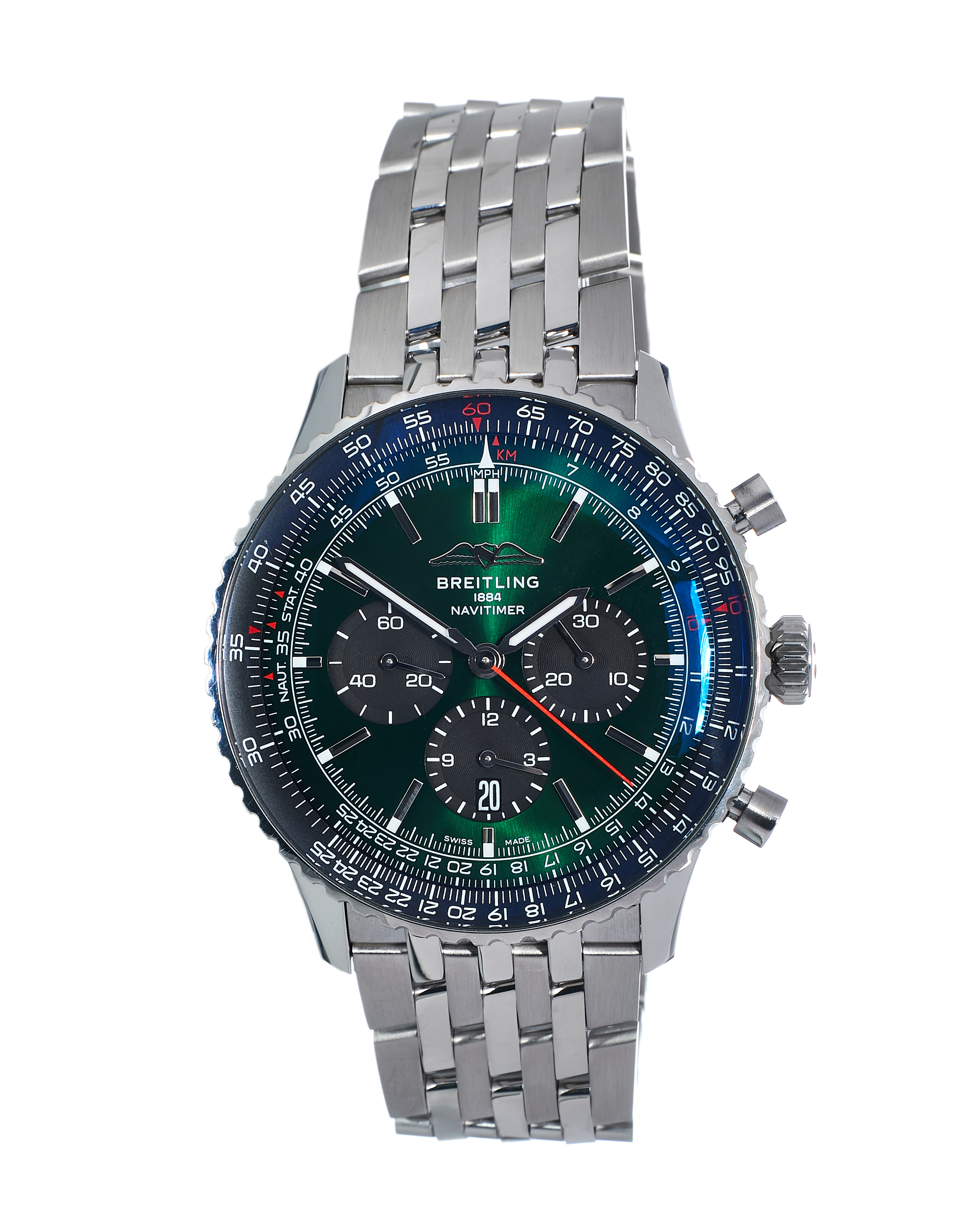 This Breitling Navitimer B01 Chronograph 46 AB0137 has a green baton dial and a bracelet strap. This Breitling has undergone a thorough inspection of water resistance, accuracy, functionality and condition to determine the level of reconditioning required to meet our strict standards. It has also been referenced against technical documents and manufacturer records where available to ensure authenticity and a clean history. All our watches have a 24-month warranty for your peace of mind.