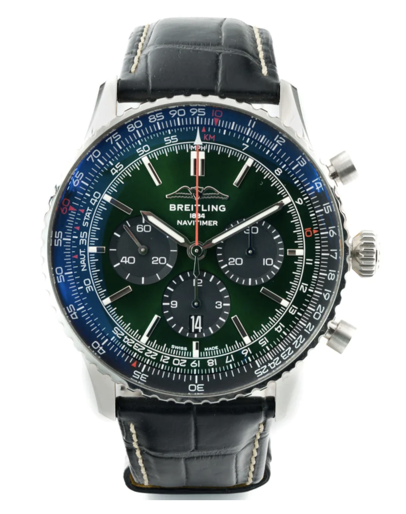 This Breitling Navitimer B01 Chronograph 46 AB0137 has a green baton dial and a leather strap. This Breitling has undergone a thorough inspection of water resistance, accuracy, functionality and condition to determine the level of reconditioning required to meet our strict standards. It has also been referenced against technical documents and manufacturer records where available to ensure authenticity and a clean history. All our watches have a 24-month warranty for your peace of mind.