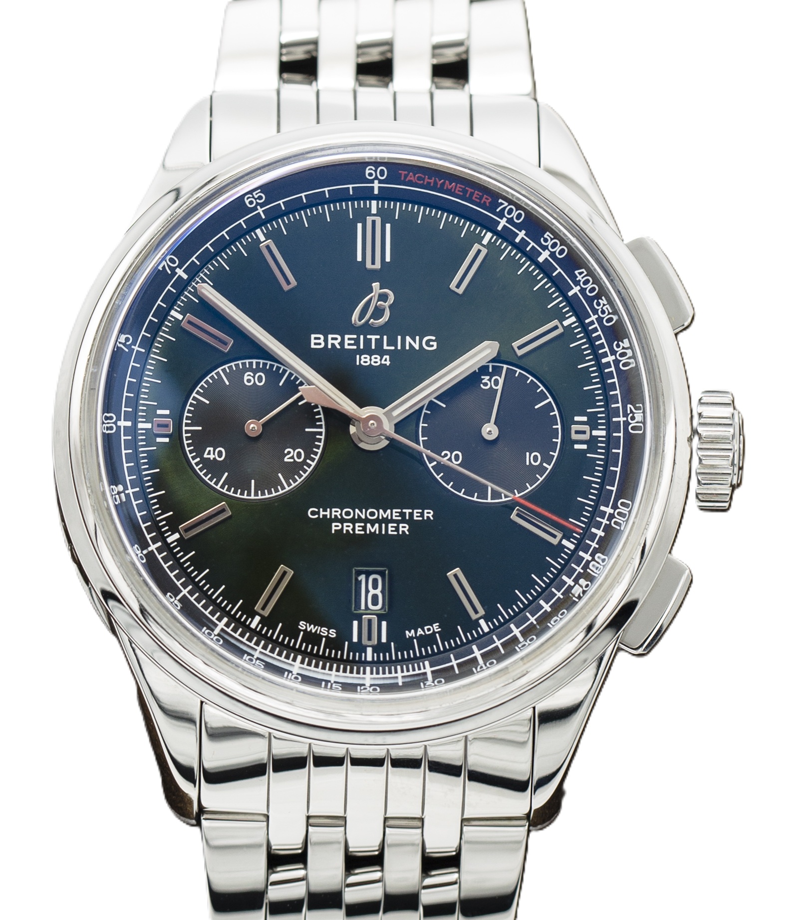 This Breitling Premier B01 AB0118 has a green baton dial and a bracelet strap. This Breitling has undergone a thorough inspection of water resistance, accuracy, functionality and condition to determine the level of reconditioning required to meet our strict standards. It has also been referenced against technical documents and manufacturer records where available to ensure authenticity and a clean history. All our watches have a 24-month warranty for your peace of mind.