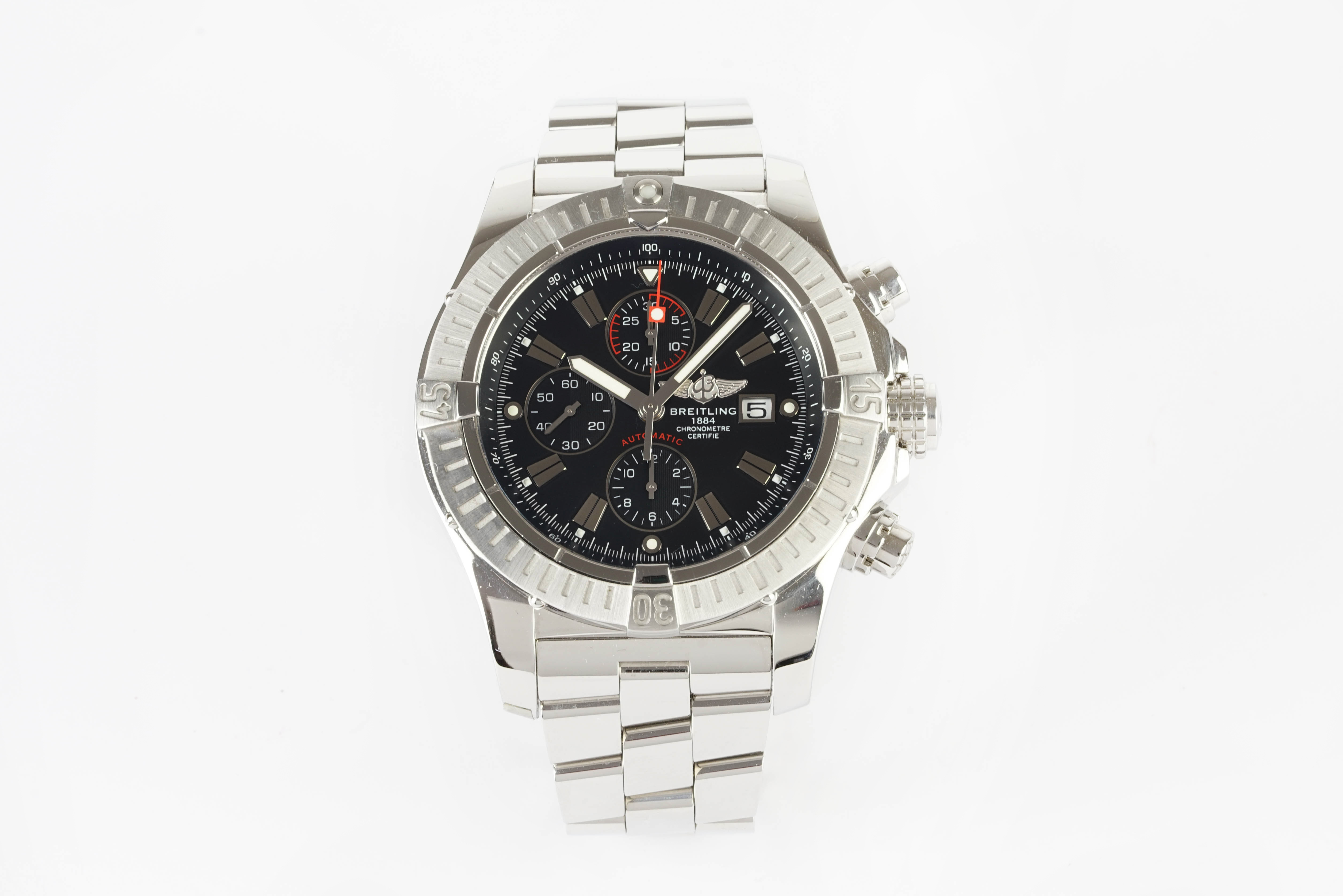 This Breitling Super Avenger II A13371 has a black baton dial and a bracelet strap. This Breitling has undergone a thorough inspection of water resistance, accuracy, functionality and condition to determine the level of reconditioning required to meet our strict standards. It has also been referenced against technical documents and manufacturer records where available to ensure authenticity and a clean history. All our watches have a 24-month warranty for your peace of mind.