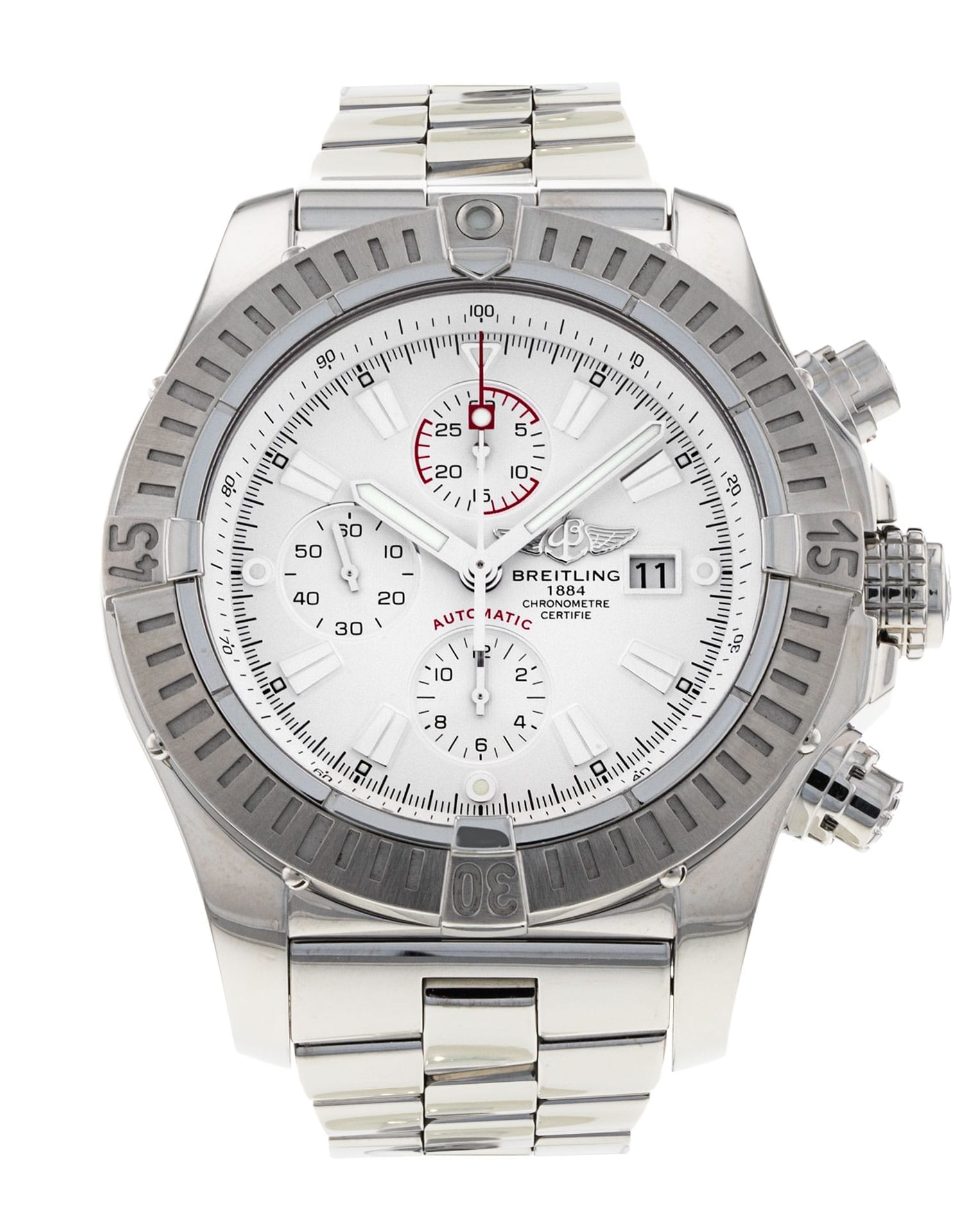 This Breitling Super Avenger A13370 has a white baton dial and a bracelet strap. This Breitling has undergone a thorough inspection of water resistance, accuracy, functionality and condition to determine the level of reconditioning required to meet our strict standards. It has also been referenced against technical documents and manufacturer records where available to ensure authenticity and a clean history. All our watches have a 24-month warranty for your peace of mind.