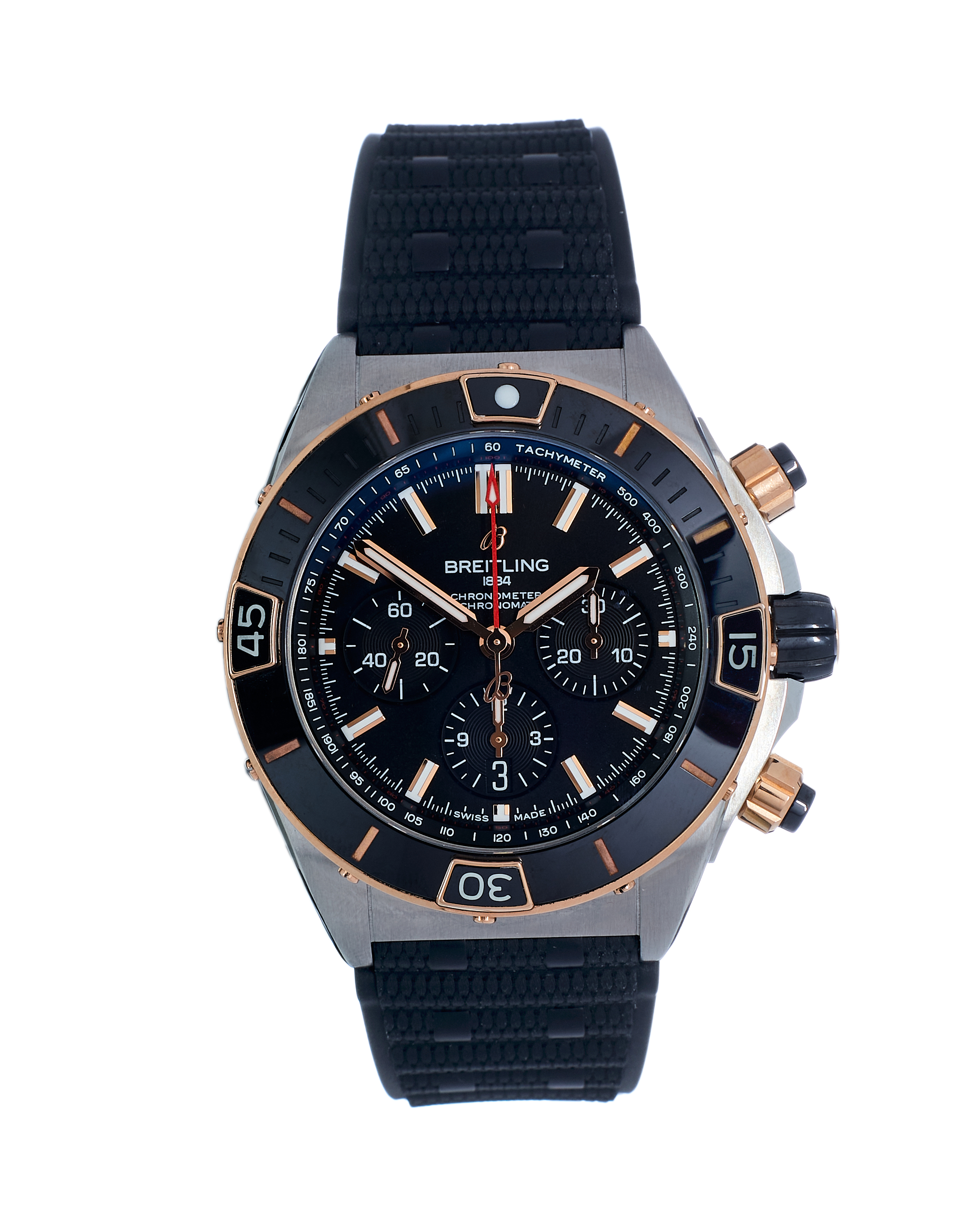 This Breitling Super Chronomat B01 44 UB0136 has a black baton dial and a rubber strap. This Breitling has undergone a thorough inspection of water resistance, accuracy, functionality and condition to determine the level of reconditioning required to meet our strict standards. It has also been referenced against technical documents and manufacturer records where available to ensure authenticity and a clean history. Our watches have a 24-month warranty for your peace of mind, in conjunction with any remaining manufacturer’s warranty from new or from service.