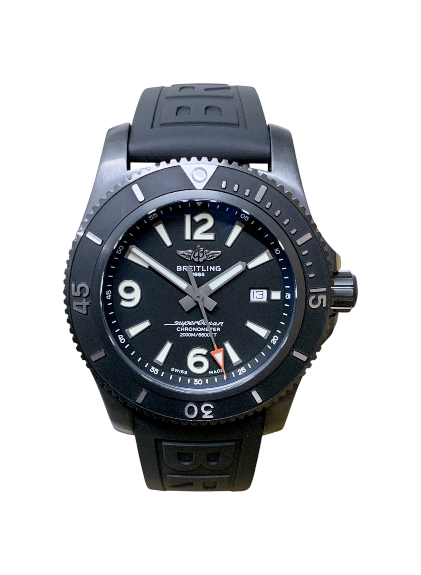 This Breitling SuperOcean Automatic M17368 has a black quarter arabic dial and a rubber strap. This Breitling has undergone a thorough inspection of water resistance, accuracy, functionality and condition to determine the level of reconditioning required to meet our strict standards. It has also been referenced against technical documents and manufacturer records where available to ensure authenticity and a clean history. Our watches have a 24-month warranty for your peace of mind, in conjunction with any remaining manufacturer’s warranty from new or from service.