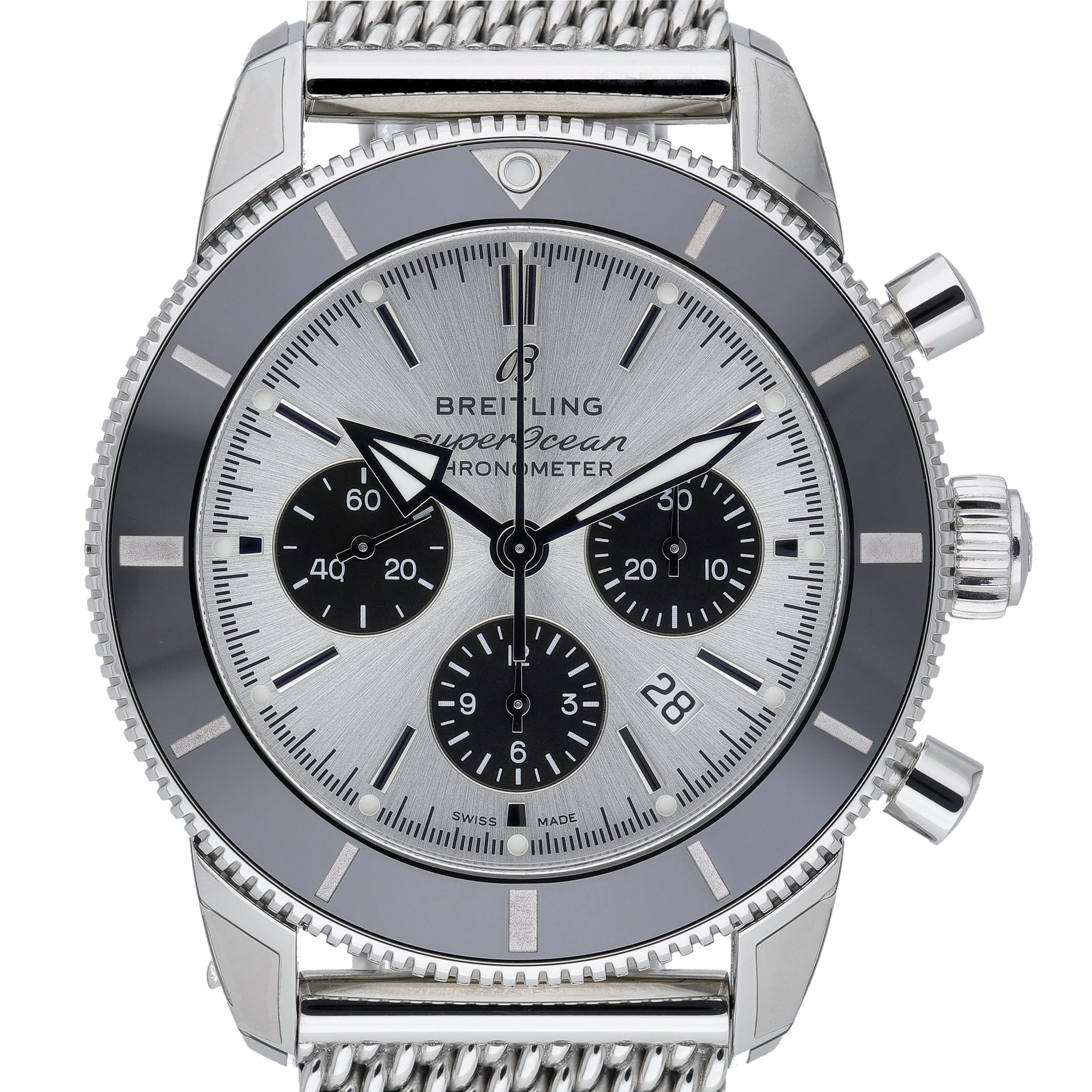 This Breitling SuperOcean Heritage B01 Chronograph 44 AB0162 has a silver baton dial and a bracelet strap. This Breitling has undergone a thorough inspection of water resistance, accuracy, functionality and condition to determine the level of reconditioning required to meet our strict standards. It has also been referenced against technical documents and manufacturer records where available to ensure authenticity and a clean history. All our watches have a 24-month warranty for your peace of mind.