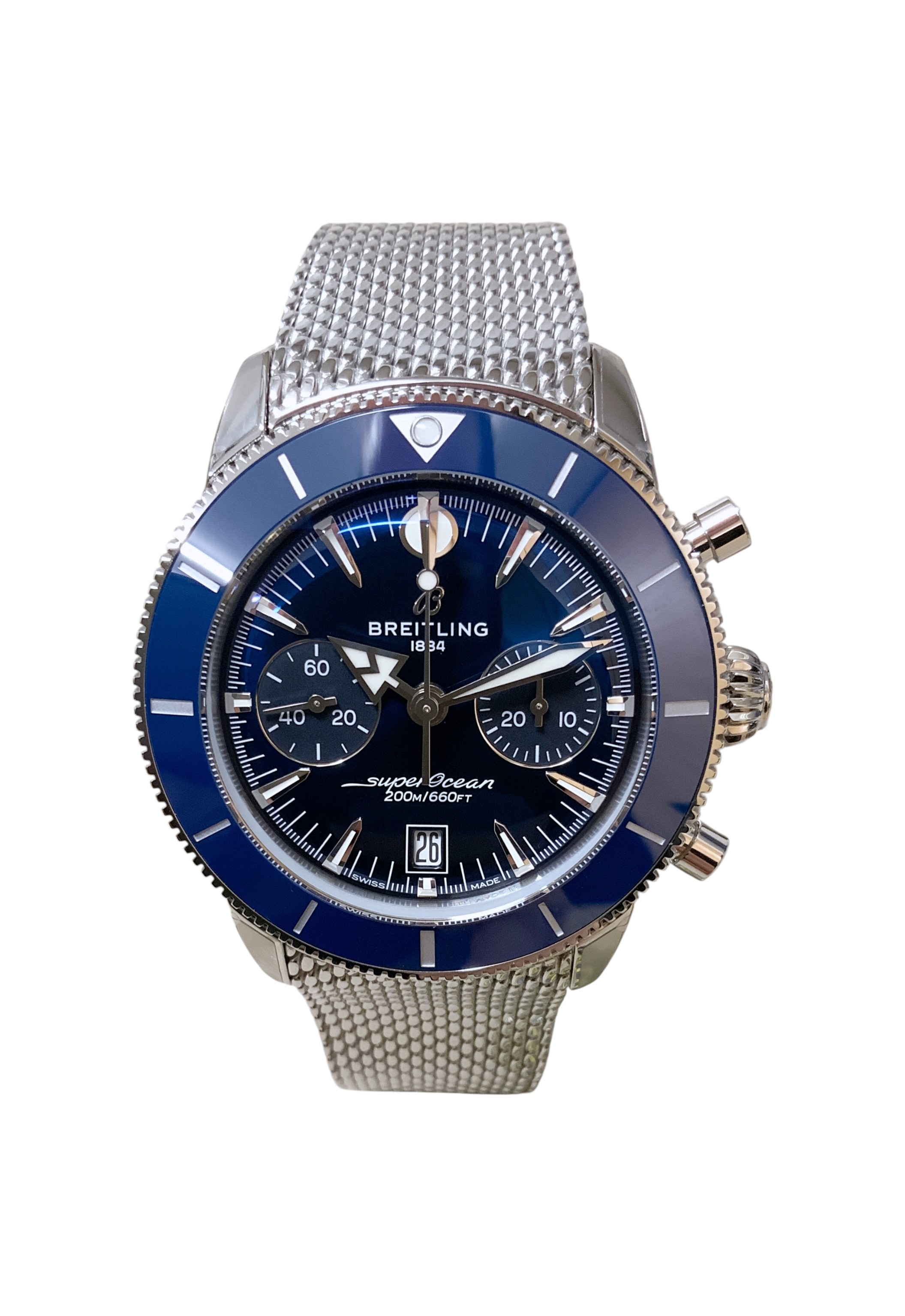 This Breitling SuperOcean Heritage AB0156 has a blue dial and a bracelet strap. This Breitling has undergone a thorough inspection of water resistance, accuracy, functionality and condition to determine the level of reconditioning required to meet our strict standards. It has also been referenced against technical documents and manufacturer records where available to ensure authenticity and a clean history. Our watches have a 24-month warranty for your peace of mind, in conjunction with any remaining manufacturer’s warranty from new or from service.