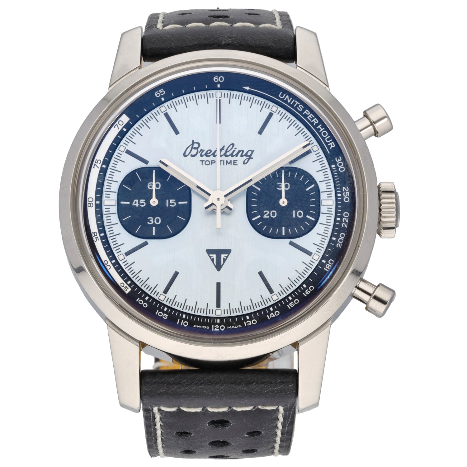 This Breitling Top Time A23311 has a ice blue baton dial and a leather strap. This Breitling has undergone a thorough inspection of water resistance, accuracy, functionality and condition to determine the level of reconditioning required to meet our strict standards. It has also been referenced against technical documents and manufacturer records where available to ensure authenticity and a clean history. All our watches have a 24-month warranty for your peace of mind.