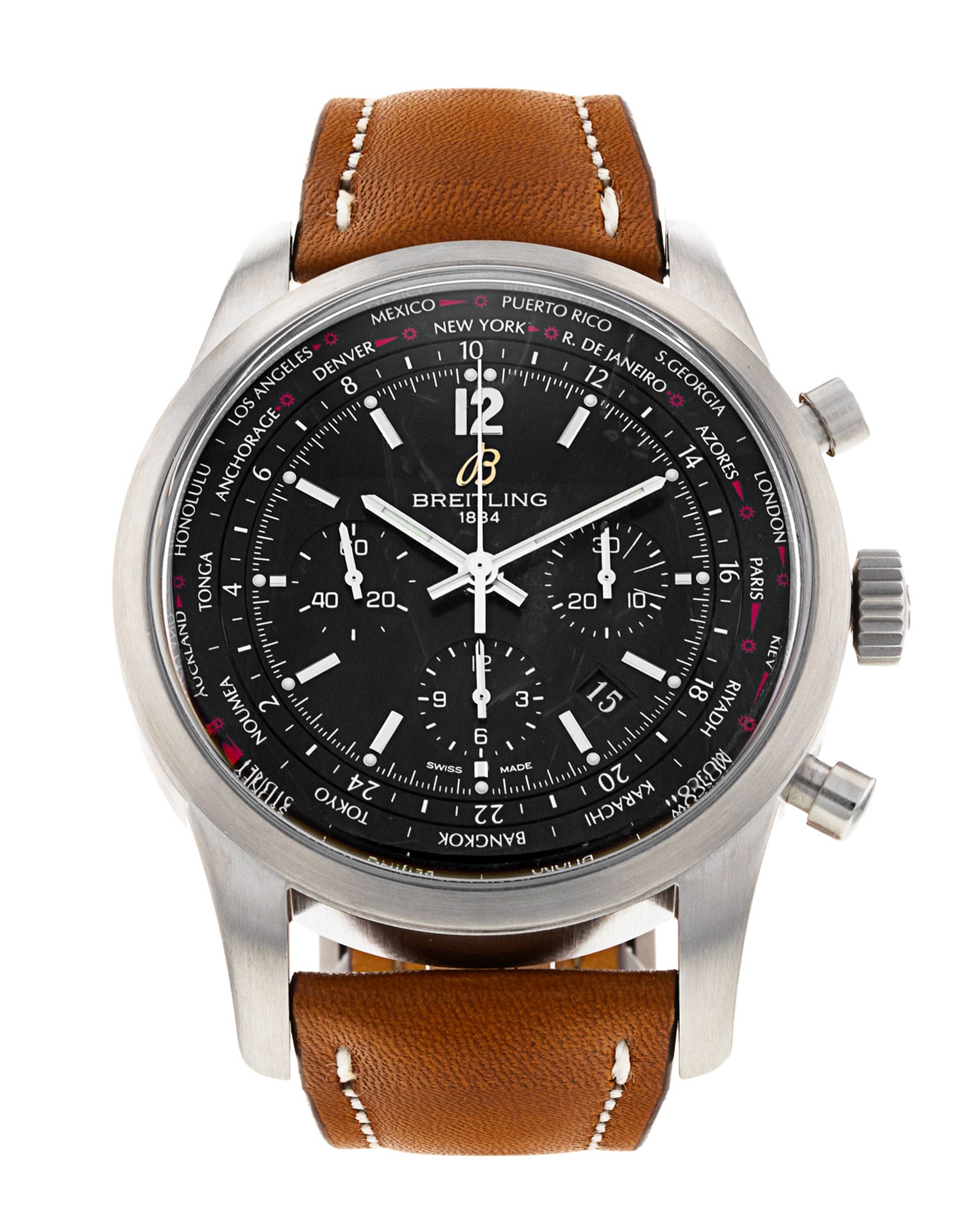 This Breitling Transocean Chronograph AB0510 has a black dial and a leather strap. This Breitling has undergone a thorough inspection of water resistance, accuracy, functionality and condition to determine the level of reconditioning required to meet our strict standards. It has also been referenced against technical documents and manufacturer records where available to ensure authenticity and a clean history. Our watches have a 24-month warranty for your peace of mind, in conjunction with any remaining manufacturer’s warranty from new or from service.
