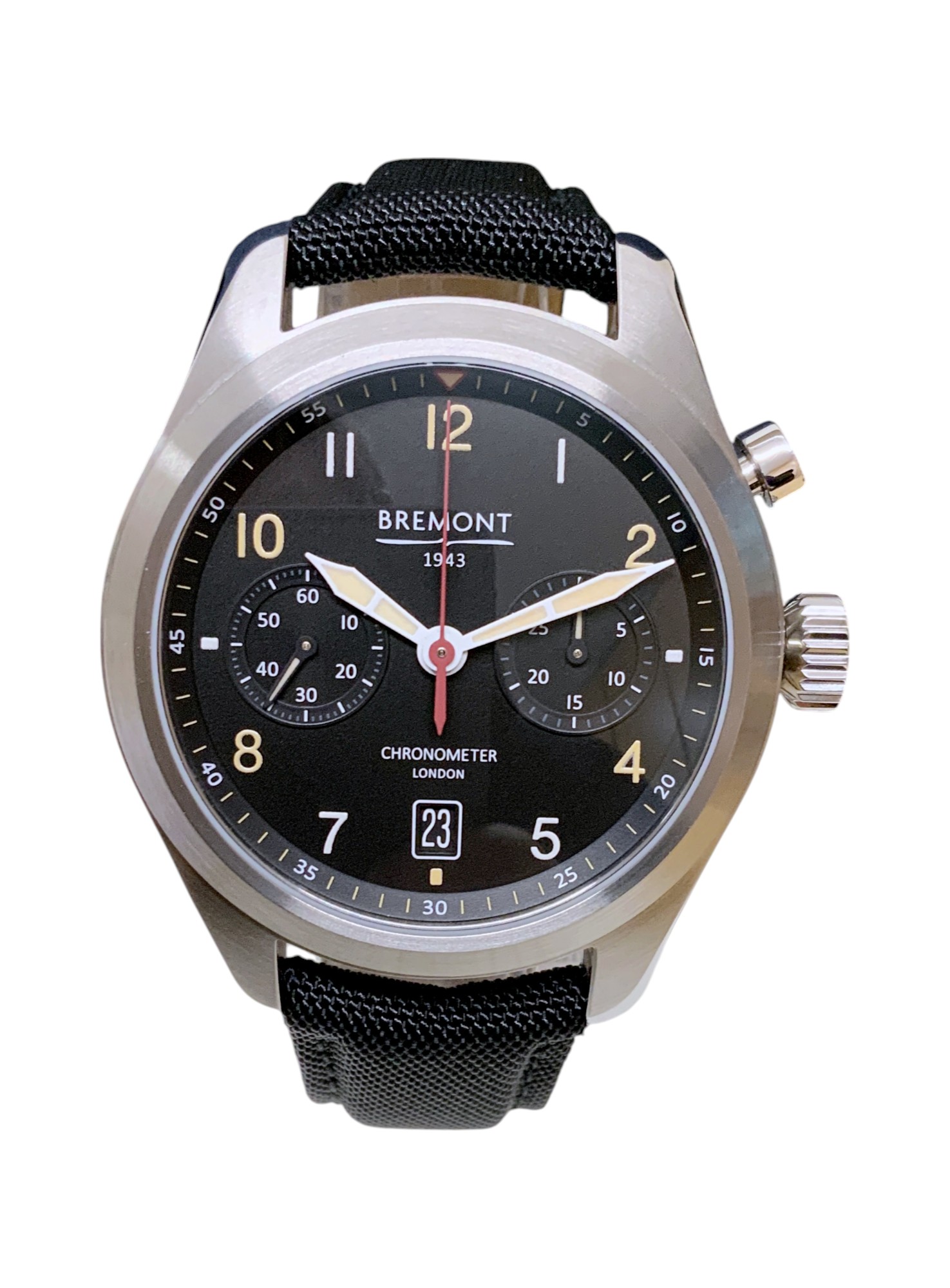 This Bremont Armed Forces Collection DAMBUSTER has a black arabic dial and a fabric strap. This Bremont has undergone a thorough inspection of water resistance, accuracy, functionality and condition to determine the level of reconditioning required to meet our strict standards. It has also been referenced against technical documents and manufacturer records where available to ensure authenticity and a clean history. All our watches have a 24-month warranty for your peace of mind.