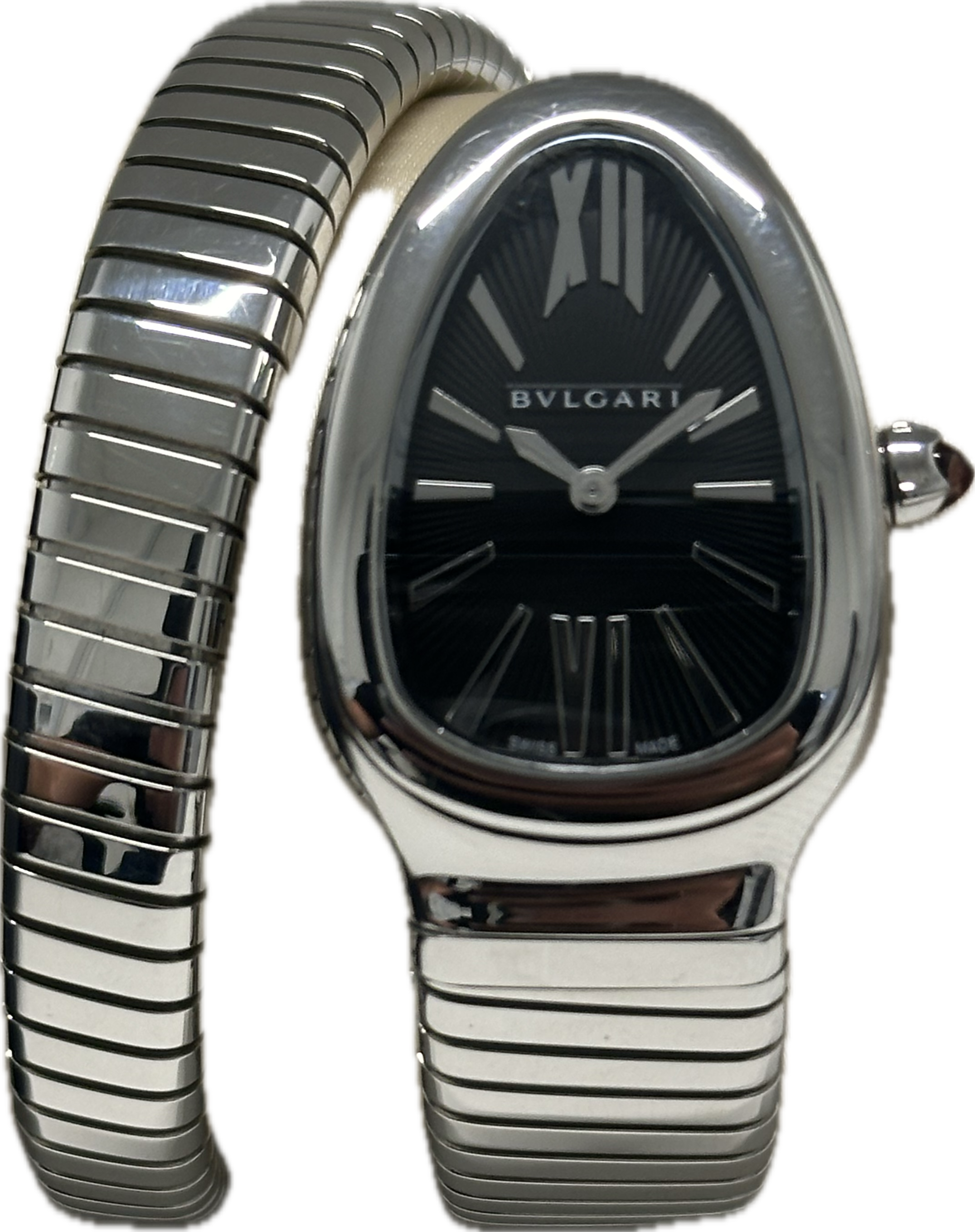 This Bvlgari Serpenti 102824 has a black dial and a bracelet strap. This Bvlgari has undergone a thorough inspection of water resistance, accuracy, functionality and condition to determine the level of reconditioning required to meet our strict standards. It has also been referenced against technical documents and manufacturer records where available to ensure authenticity and a clean history. All our watches have a 24-month warranty for your peace of mind.